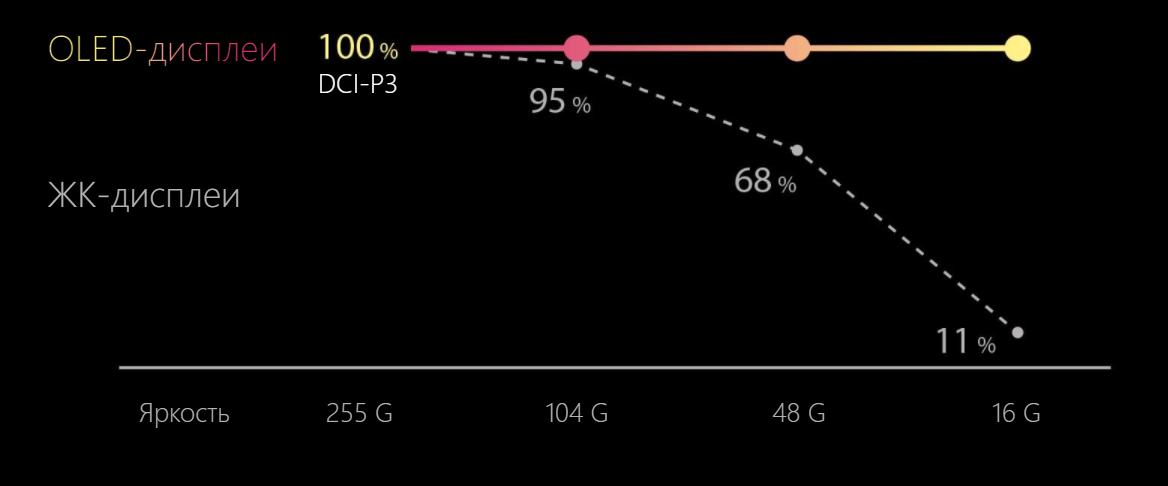 Цветопередача ЖК- и OLED-дисплеев при одинаковом уровне яркости