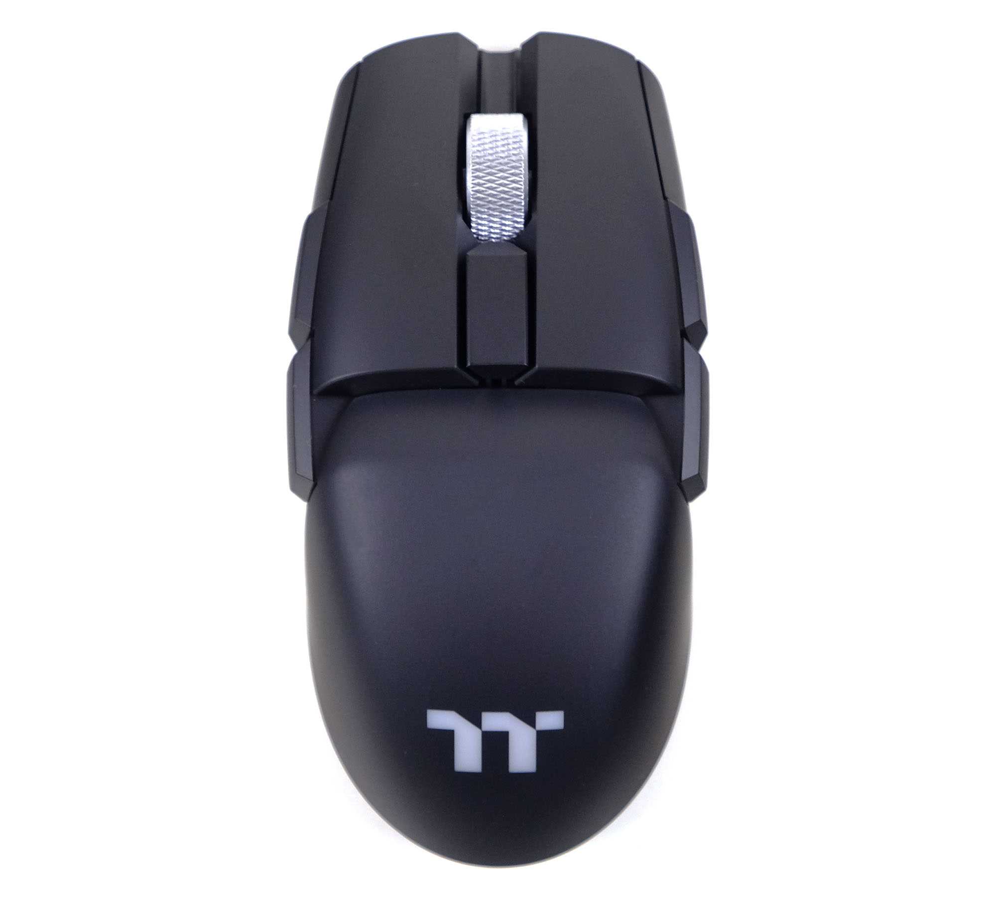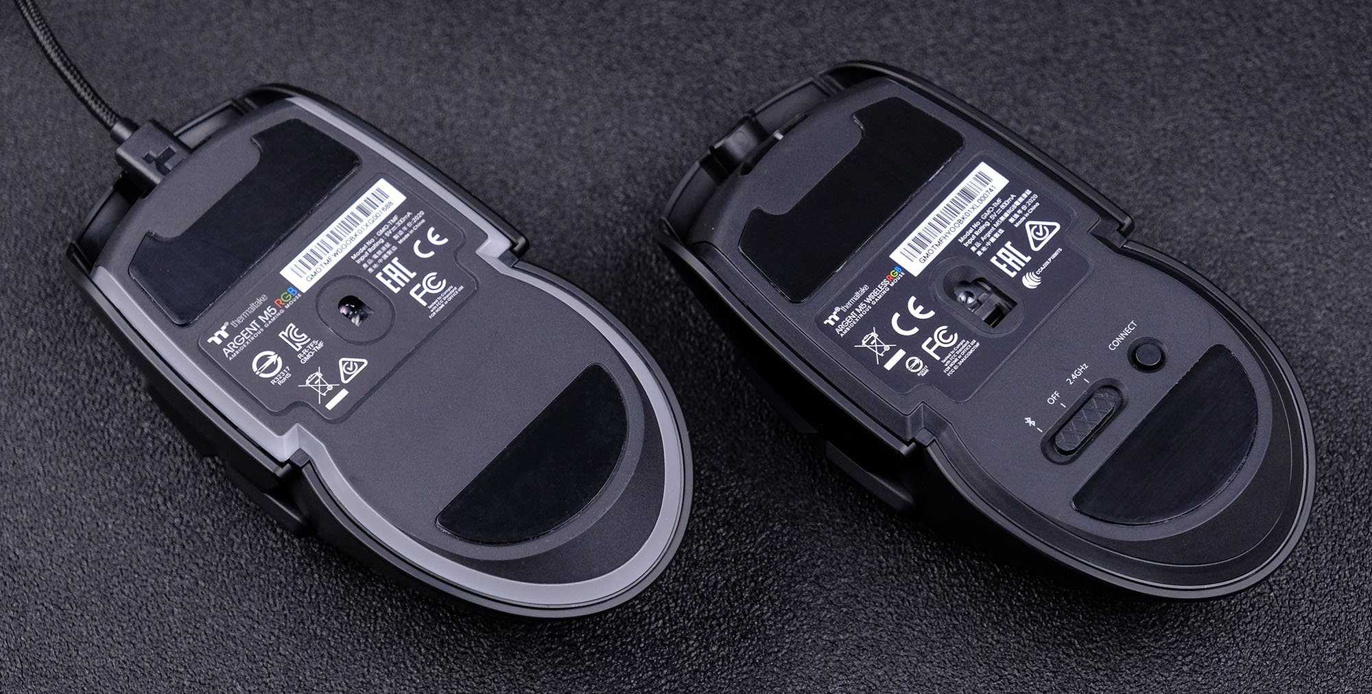 Отличия беспроводной мышки от обычной видны, если их перевернуть. У последней есть светодиодная ARGB полоса вдоль всего периметра, так что подсветка здесь будет гораздо заметнее. У wireless версии подсвечиваются только буквы логотипа TT сверху.