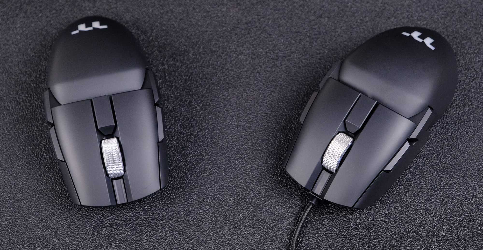 Корпус у обоих устройств выполнен из качественного матового пластика, на котором следы от пальцев видны, но не так заметны. У мышек в наличии по 8 кнопок, учитывая клик колёсика – по 4 симметричных боковых клавиши, что делает мышь удобной и для левшей, а также есть кнопка переключения профилей настроек и DPI по центру. Внешний вид у мышек получился удачный – в меру «агрессивные» игровые черты на довольно обтекаемом корпусе, металл колёсика хорошо сочетается с матовой поверхностью.