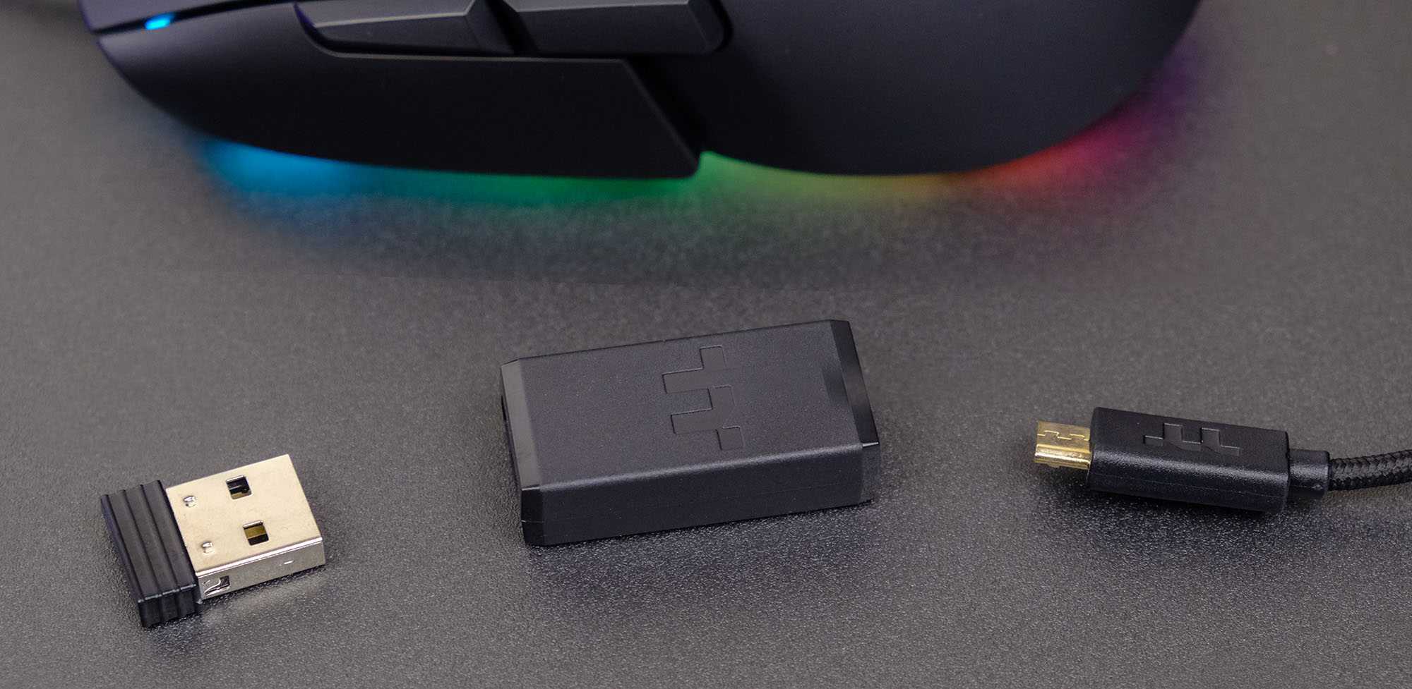 Адаптер 2,4 ГГц может быть подключен к кабелю и находится максимально близко к мыши, чтобы избежать случайных помех.