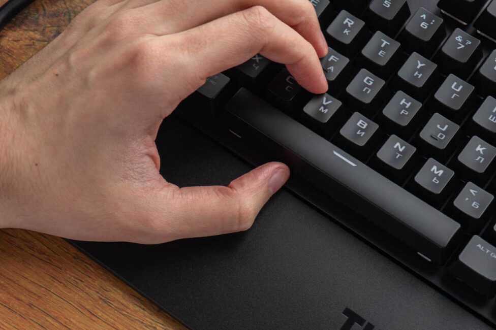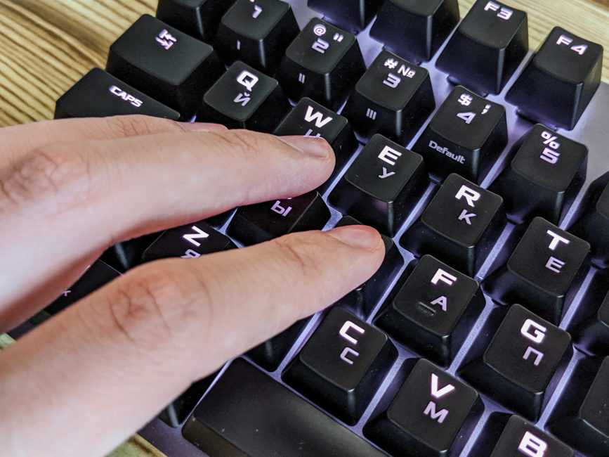 Наш образец клавиатуры с тактильными переключателями, то есть получаем тактильную отдачу и различимый щелчок. В случае с линейными — звука щелчка не будет. То есть если вас смущает громкий звук при использовании — это, стало быть, выход. В тактильных переключателях сила срабатывания составляет 50 г, ход клавиш — 3,55 мм, а высота срабатывания — 1,5 мм. Звук издается и назвать его тихим я не могу.