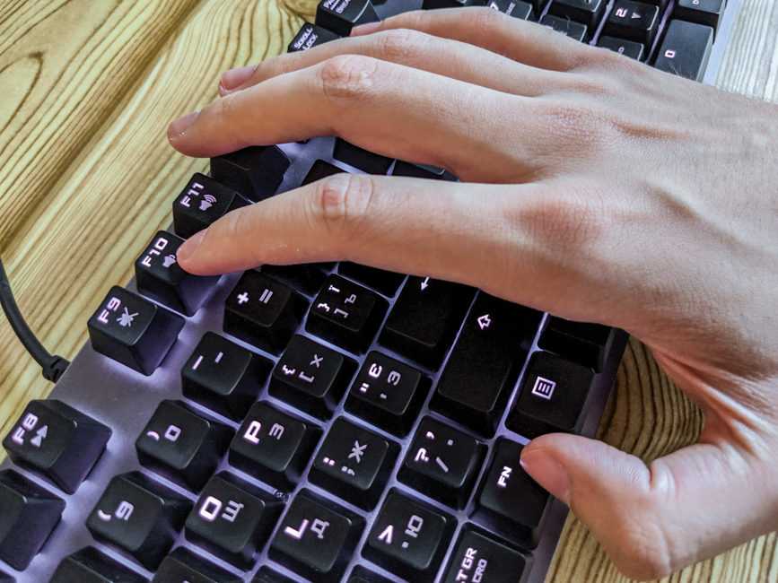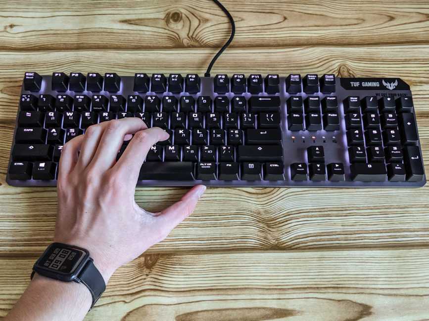 Пользоваться ASUS TUF Gaming K3 — однозначно приятно. У неё привычная раскладка, не требующая какого-либо переучивания или дополнительного привыкания. Ход четкий, срабатывание происходит ещё на половине нажатия и в целом на клавиатуре очень приятно набирать текст и, конечно же, играть.