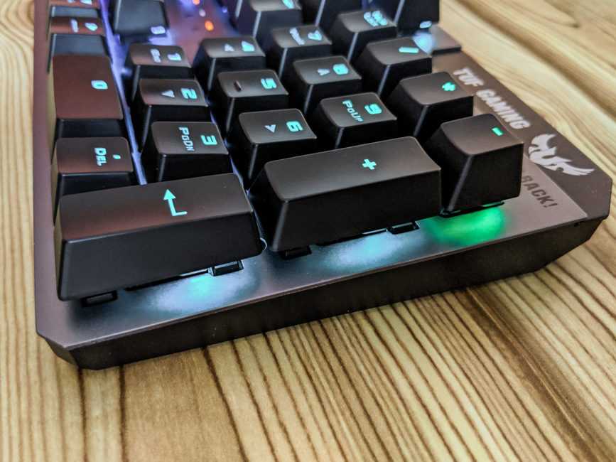 Естественно, клавиатура наделена полноценной RGB-подсветкой совместимой с технологией AURA Sync. Подсвечиваются только сами клавиши — никаких светящихся логотипов, полос и всего остального в этой модели нет. Сама подсветка относительно равномерная, но нижняя часть тех же кириллических символов в любом случае будет чуть темнее. Не очень приятно, но что требовать от относительно недорогой механики, когда даже у топовых «клав» линейки ASUS ROG такое встречается.