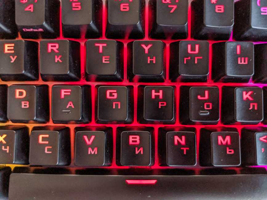 Каждая клавиша содержит настраиваемую LED-подсветку на миллионы всевозможных цветов, уровней яркости насчитывается четыре. «Лампочка» находится сверху над переключателем и потому лучше всего подсвечены именно латинские символы. Вот кириллические уже светятся неравномерно, выглядят немного тускловатыми на общем фоне.