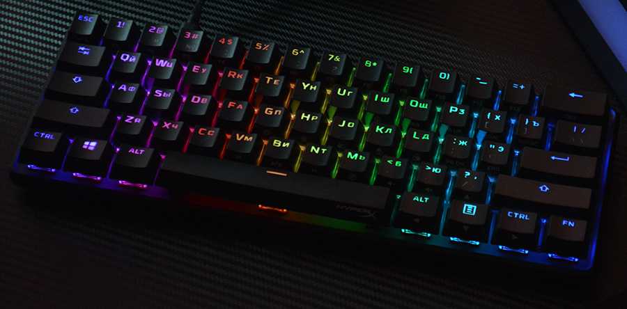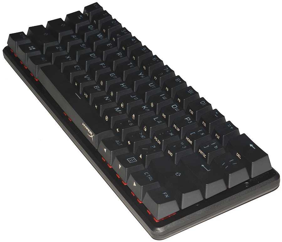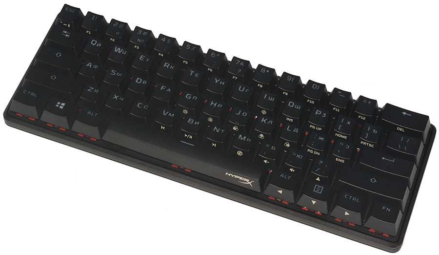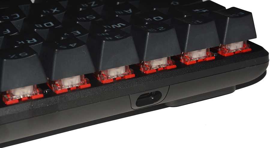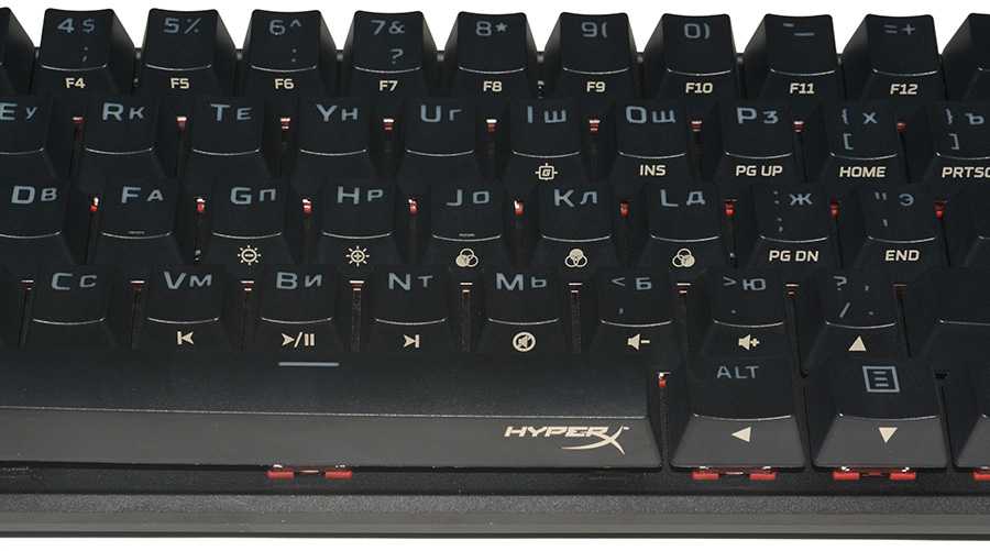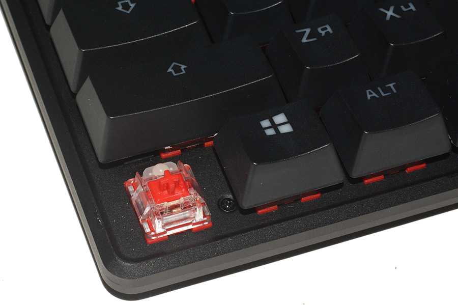 В клавиатуре установлены механические переключатели HyperX Red Switch, которые являются аналогом всем известных Cherry MX Red. Это линейные переключатели без явного тактильного отклика. Усилие для нажатия равно 45 г. Срабатывание происходит примерно посередине хода клавиши. Ресурс переключателей составляет 80 млн. кликов.