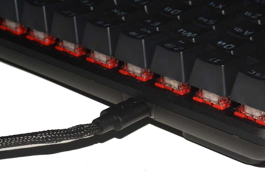 Отсоединяемый шнур в тканевой оплётке подключается ближе к правому краю задней боковой стороны. Жесткость средняя. Имеется и заметный эффект памяти. На работе это никак не сказывается, ведь клавиатура – это не мышь, где мягкость кабеля имеет первостепенное значение.