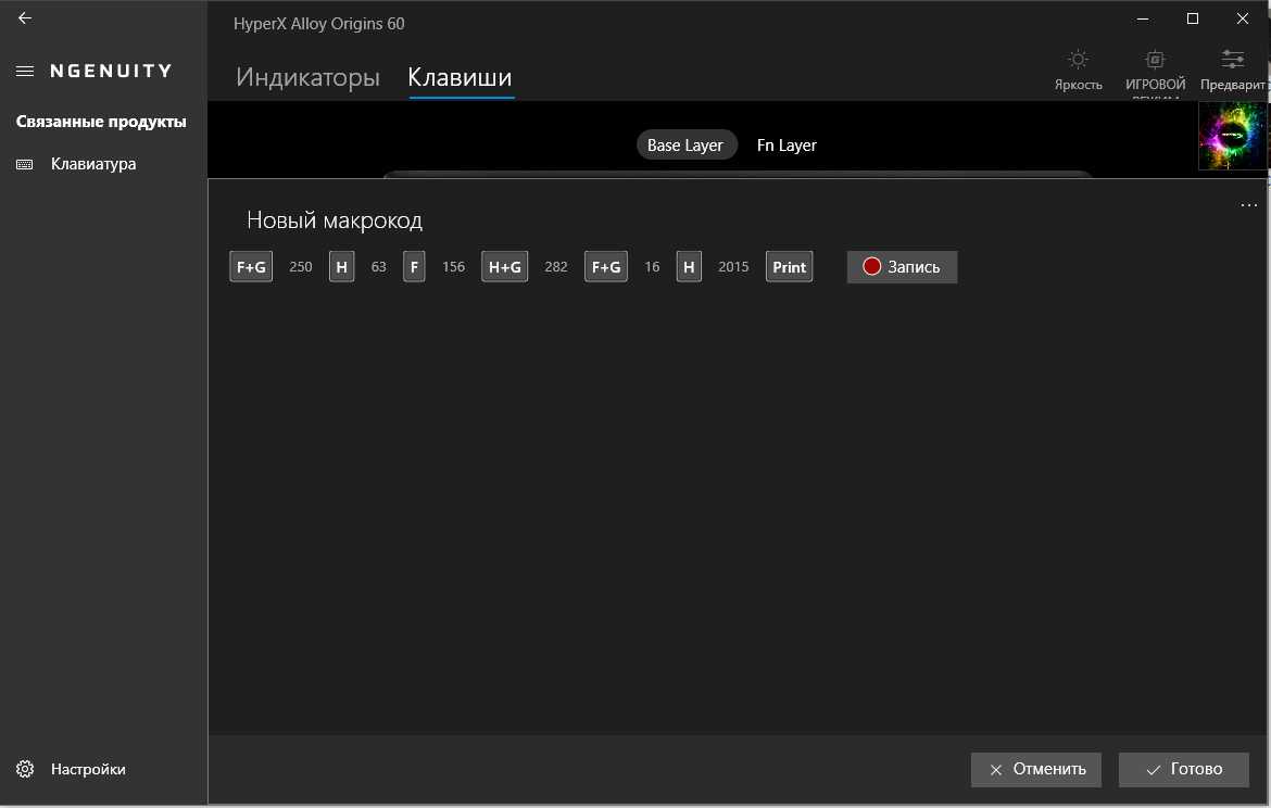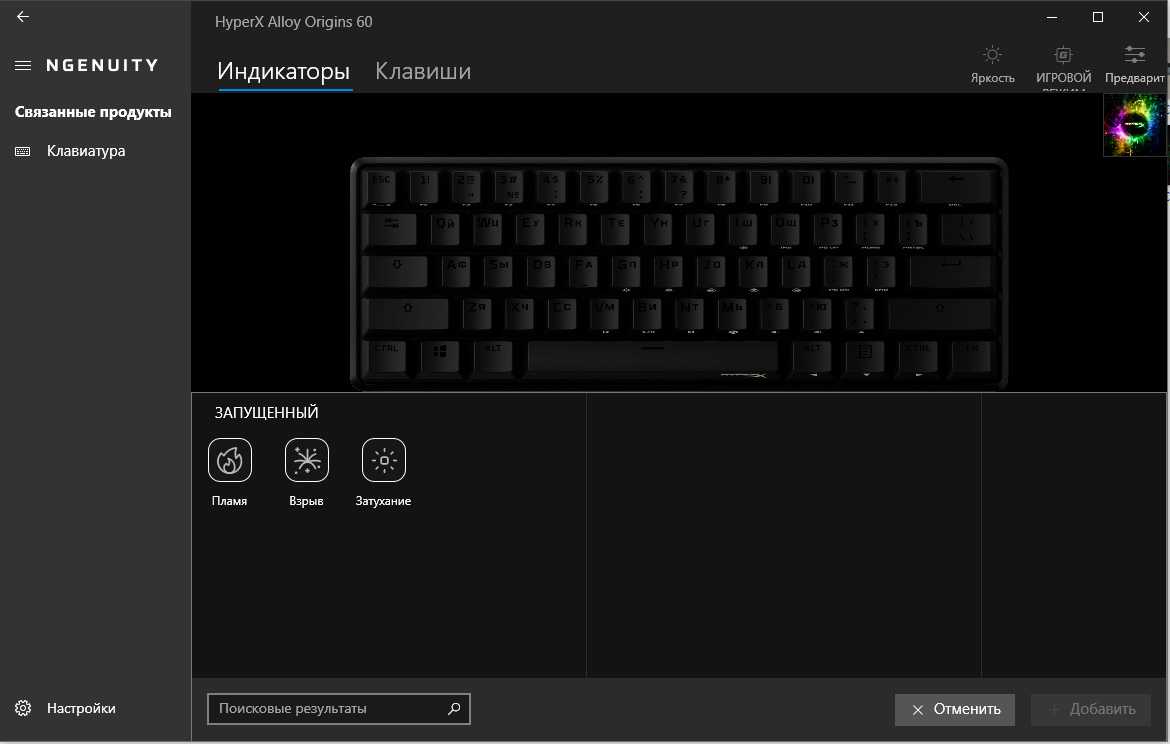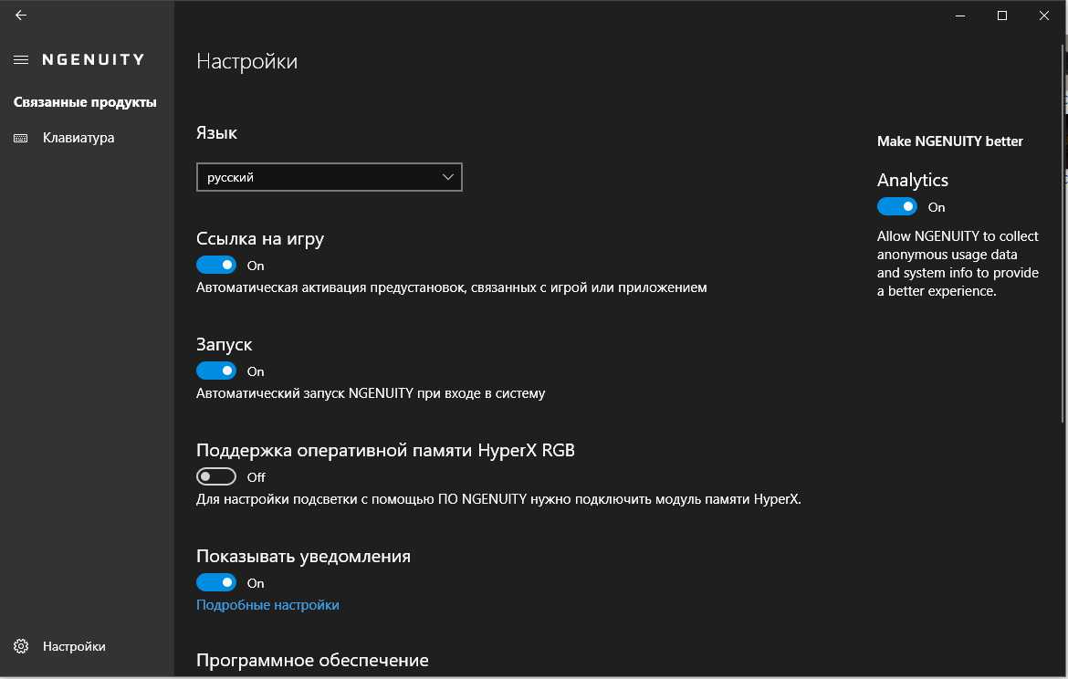 Для настройки и управления функциями клавиатуры используется ПО HyperX NGENUITY. Скачать его можно с официального сайта производителя.