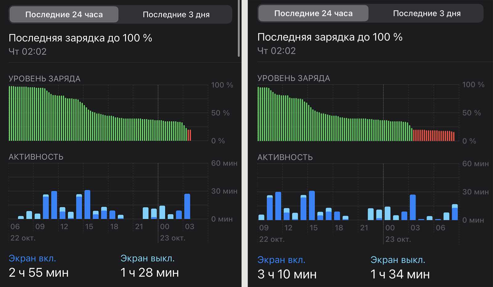 За два дня я использовал несколько Pro то одновременно, то попеременно. Отсюда относительно невысокое время работающего экрана. Чтобы получить какую-никакую реальную статистику, я посидел с «прошками» пару часов и пробовал их в разных сценариях, следя за процентами заряда в углу экрана.
