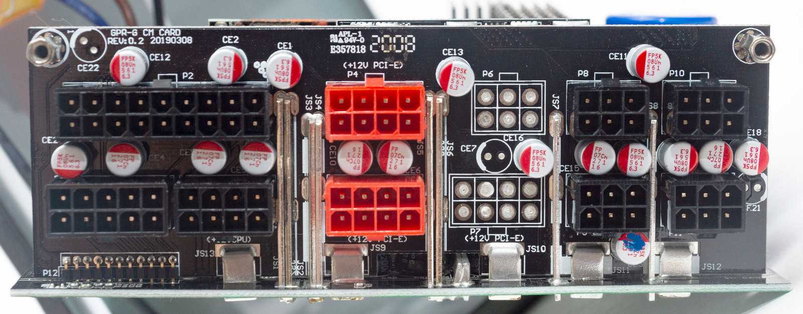 На тыльной панели разъемы для модульных кабелей. Для питания карт VGA они помечены красным цветом, что уже практически не встречается у других брендов. Сами разъемы не промаркированы, но сверху имеется наклейка с указанием их назначения.