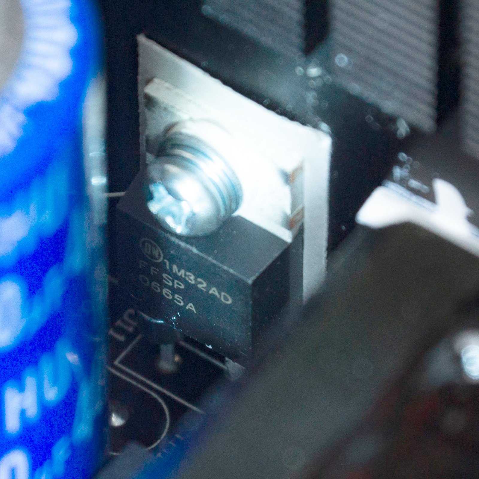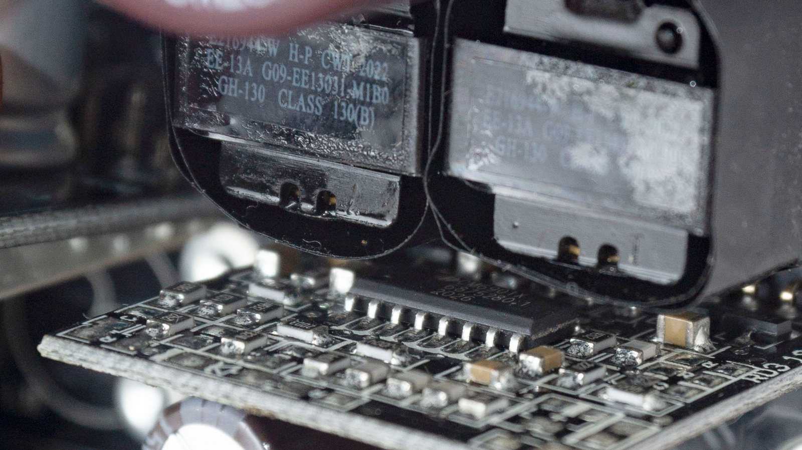 Трансформатор, формирующий линию +12 В, непосредственно соединен с вертикальной платой с силовыми элементами этого канала.