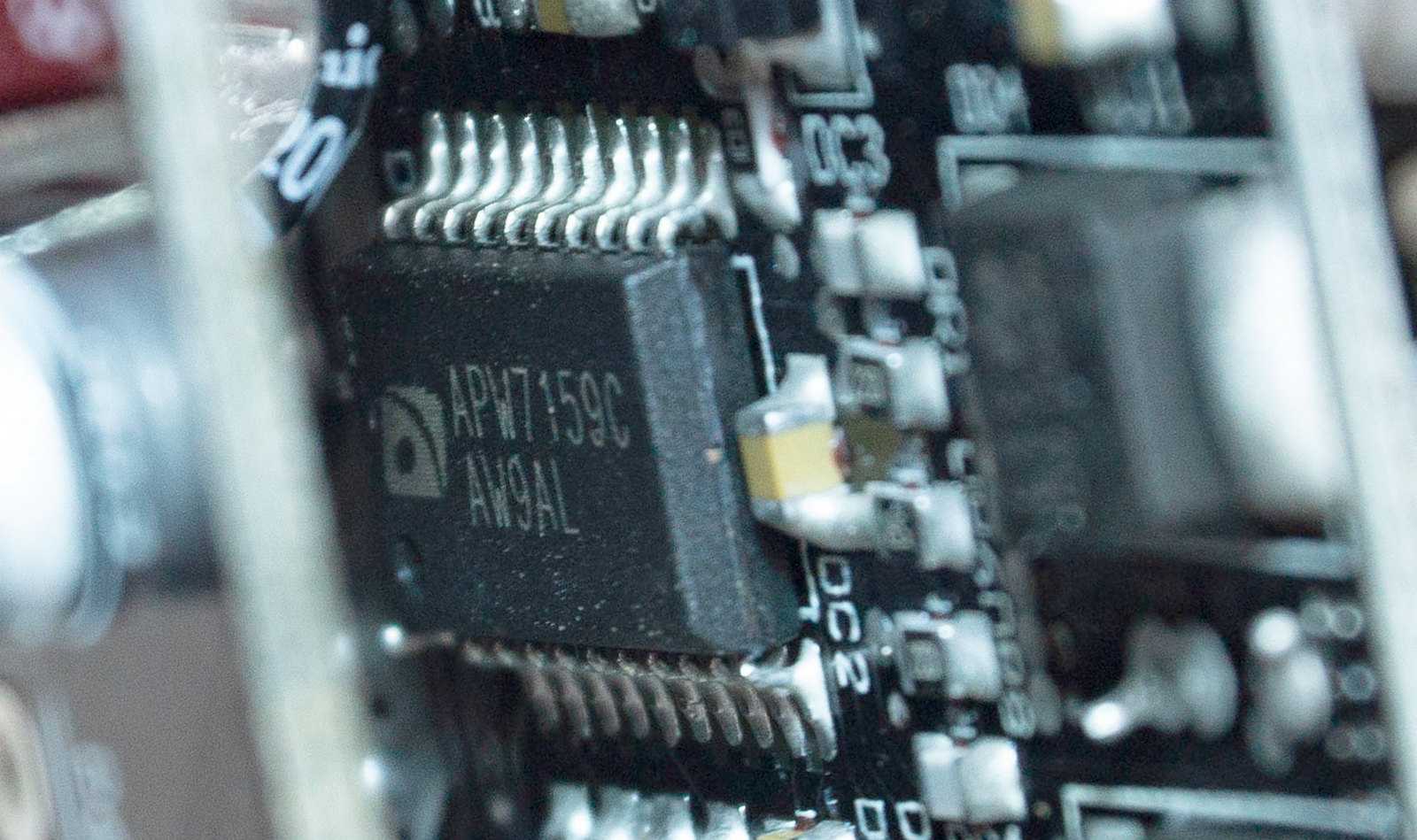 На отдельной вертикальной плате DC-DC преобразователь: четыре мосфета UBIQ QM3016D по 68 А, ШИМ-контроллер ANPEC APW7159C и парочка дросселей.