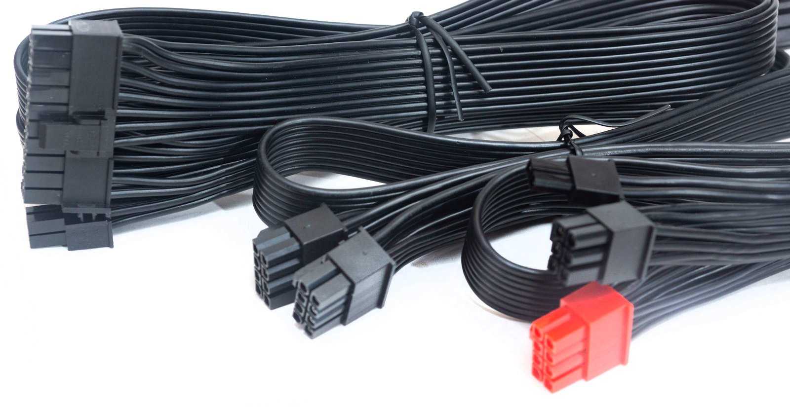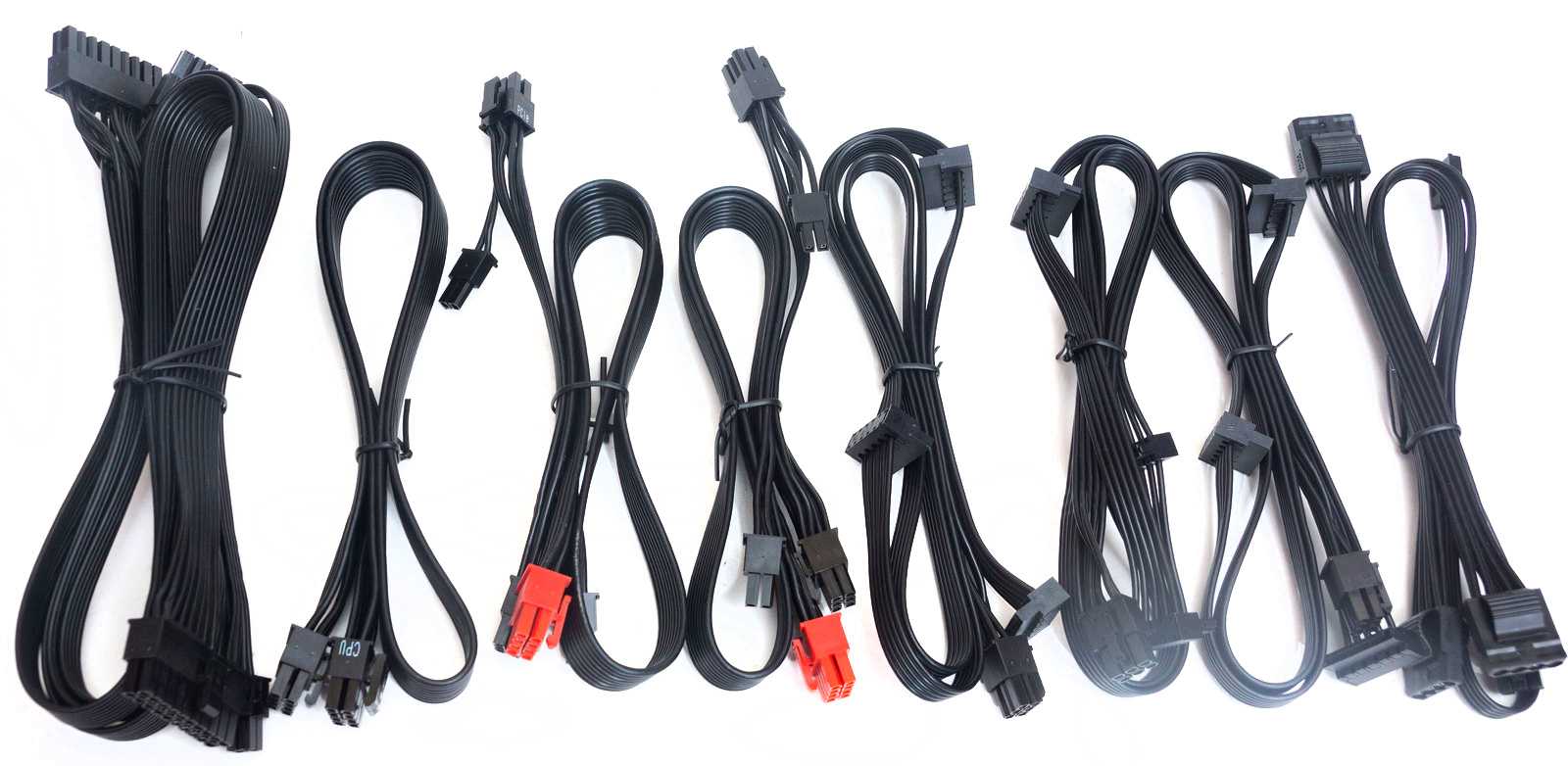 Все кабели в виде плоских мягких шлейфов калибра 16AWG для питания CPU и VGA и 18AWG для периферии и питания материнской платы. Набор проводов несколько архаичен для современной модели БП, прежде всего за счет отсутствия второго 8-пин кабеля для питания CPU. Также при нижнем расположении БП нет необходимости в столь длинных шлейфах для периферии, достаточно 60 см.