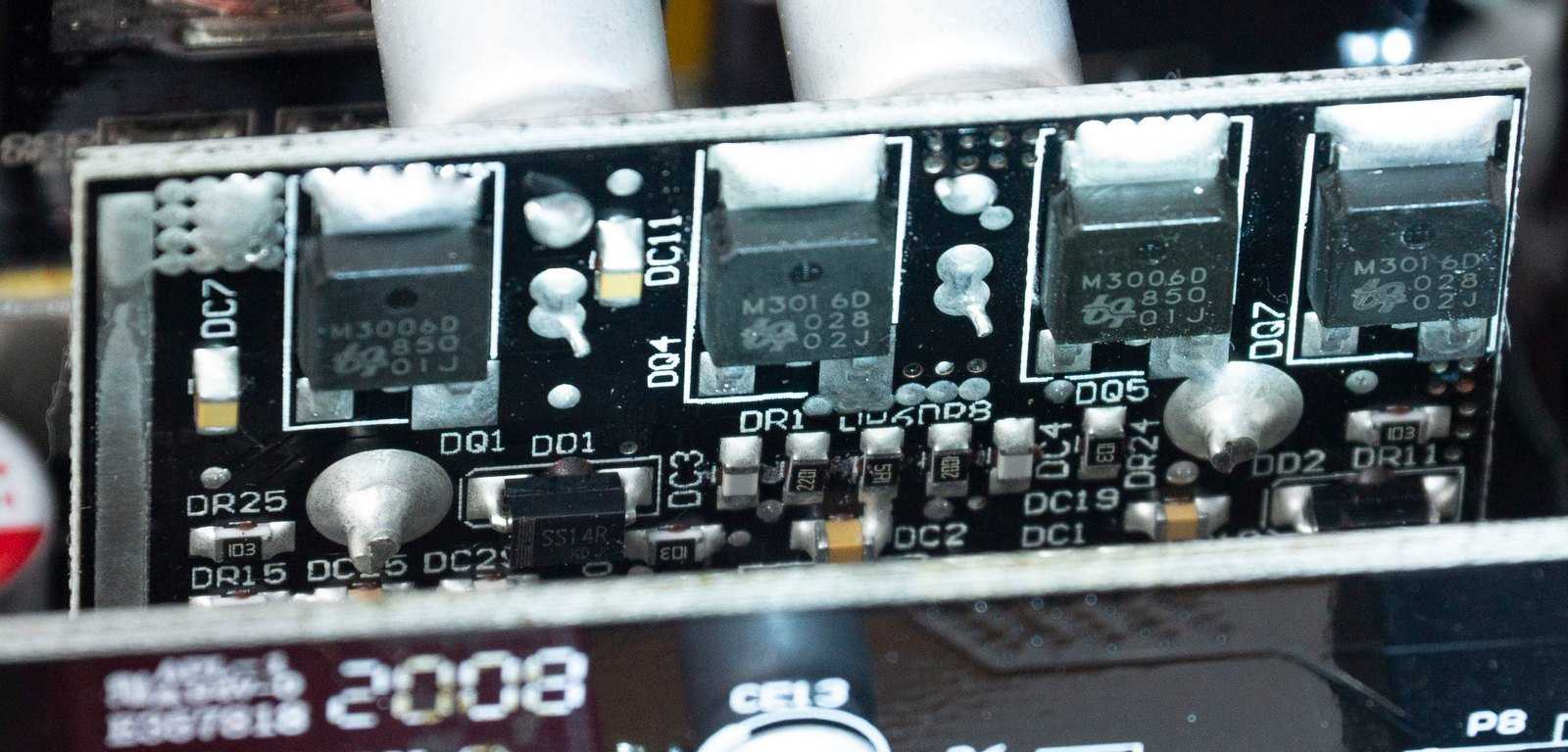 На плате шесть мосфетов Semiconductor NTMFS5C430N по 185 А, они охлаждаются пластиной в нижней части платы.