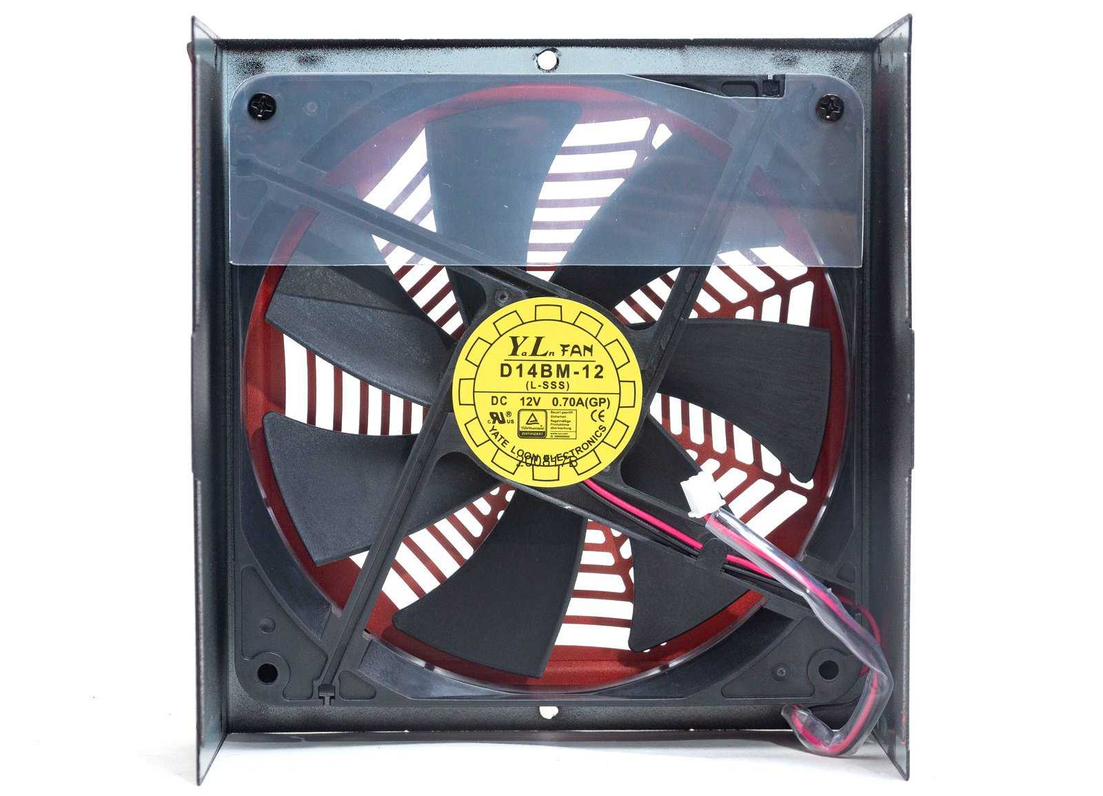 За охлаждение комплектующих отвечает 140-мм вентилятор D14BM-12 от компании Yate Loon Electronics. Двойной подшипник качения предполагает высокий ресурс его работы. Номинальная скорость вращения — 1400 об/мин, для 140 мм размера этого вполне достаточно.