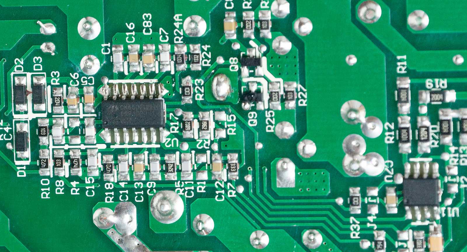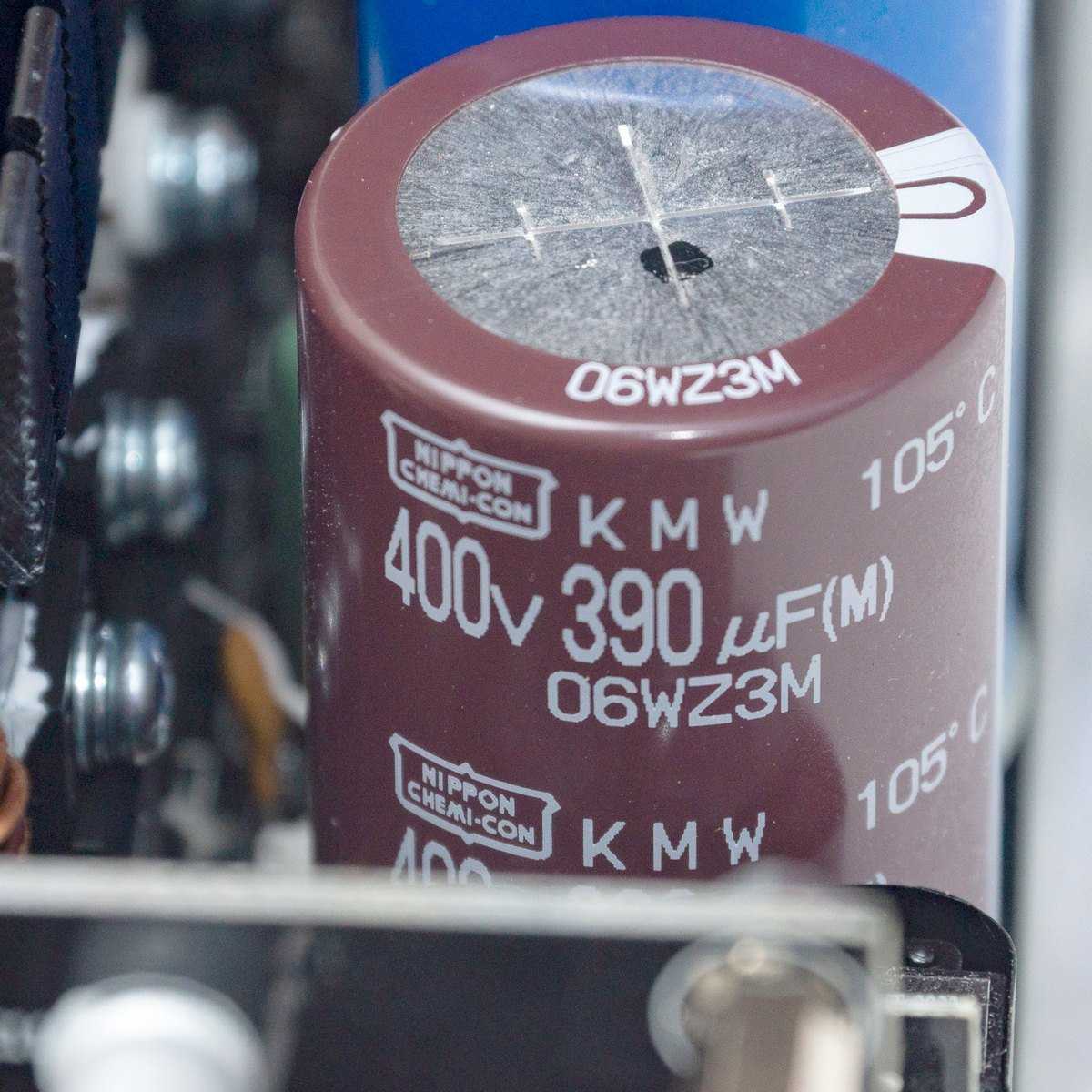 На краю платы находятся два конденсатора высоковольтной цепи от японской компании Nippon Chemi-Con. Коричневый емкостью 390 мкФ, рассчитанный на напряжение 400 В из высокотемпературной серии 105 °C, второй — синий без маркировки бренда, 470 мкФ, 400 В, также высокотемпературной серии.