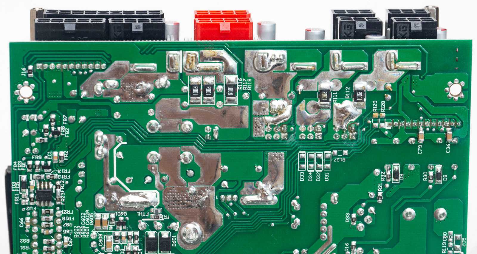 С обратной стороны мы видим аккуратную пайку, часть дорожек усилена припоем.