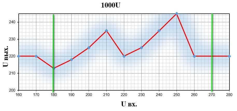 Графики, полученные на разных моделях, практически идентичны, различия только в отклонении напряжений на выходе. Это зависит от модели установленного трансформатора. Самый стабильный график у модели 1000U, минимальные просадки — 213 В, максимальные — до 245 В.