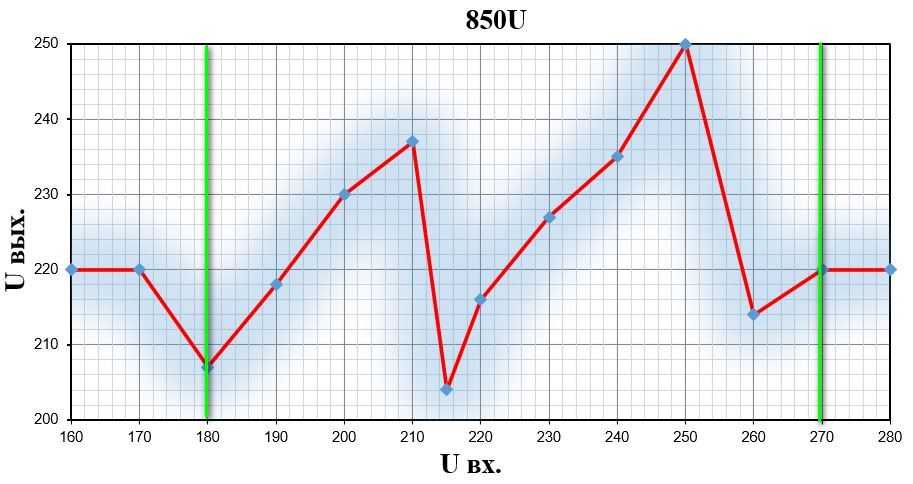 650U проседал до 206 В. Самые большие колебания были у модели 850U – 204 В по минимуму и 250 В по максимуму.