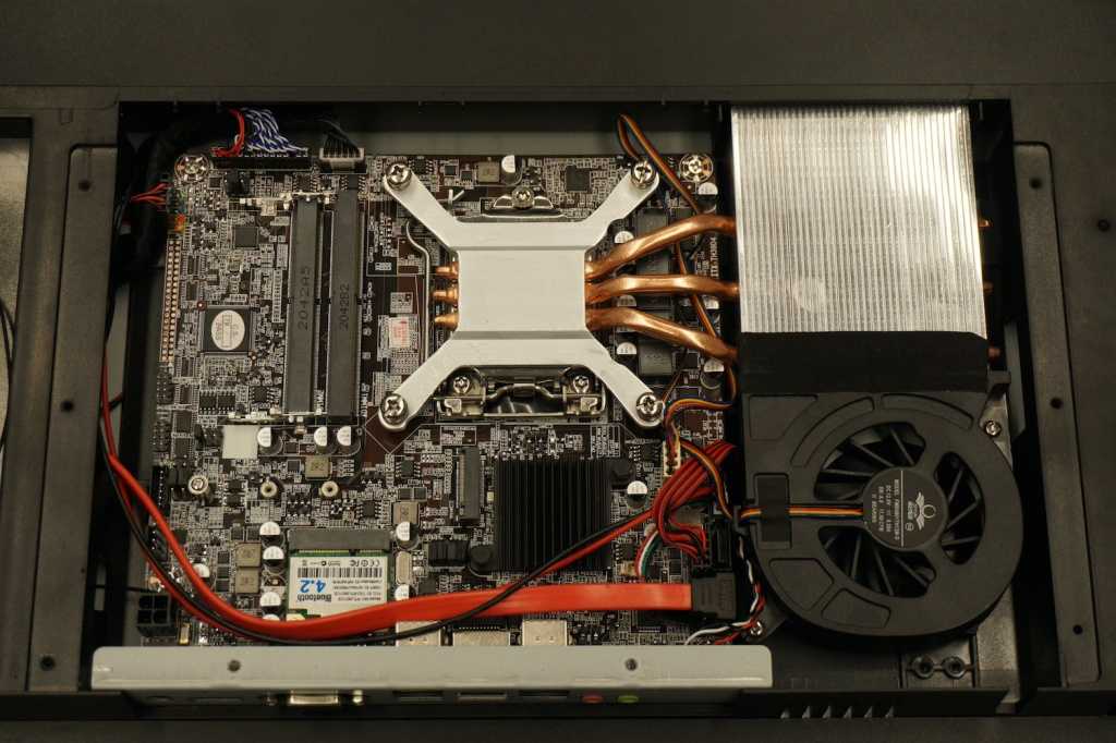 Ну и пара интересных мелочей. На материнской плате уже установлен Wi-Fiмодуль Intel 3165NGW (802.11ac, 2,4/5 ГГц, максимальная скорость 433 Мбит/с, встроенный Bluetooth 4.2), также имеется разъём для вывода ещё двух USB 2.0 портов, 4pin разъём для подключения второго вентилятора, разъём («гребёнка») VGA и разъёмы для подключения LCD дисплея (в их числе — LVDS 30pin). Вполне возможно, что на базе данной системы может быть создан POS-терминал.