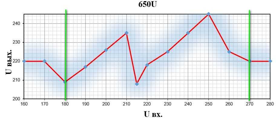 Во всех моделях переключение на питание от аккумулятора происходило при входящих напряжениях менее 180 В и более 270 В. Что составляет +/- 20%. Момент переключения на графиках обозначен зеленой линией.