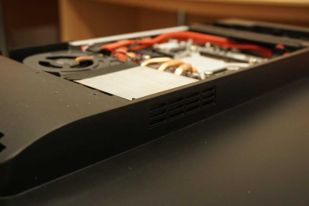 Хотя основной забор воздуха осуществляется через перфорацию на верхней съёмной крышке аккурат над процессорным кулером. Но перед разборкой нужно посмотреть на заднюю часть корпуса. Тут находятся ещё четыре порта USB, на этот раз стандарта 3.0 (итого – восемь портов USB), видеовыходы HDMIи VGA, два Wi-Fiконнектора, сетевой коннектор LANRJ45, разъём для подключения внешнего блока питания, а также отверстие для замка Kensington.