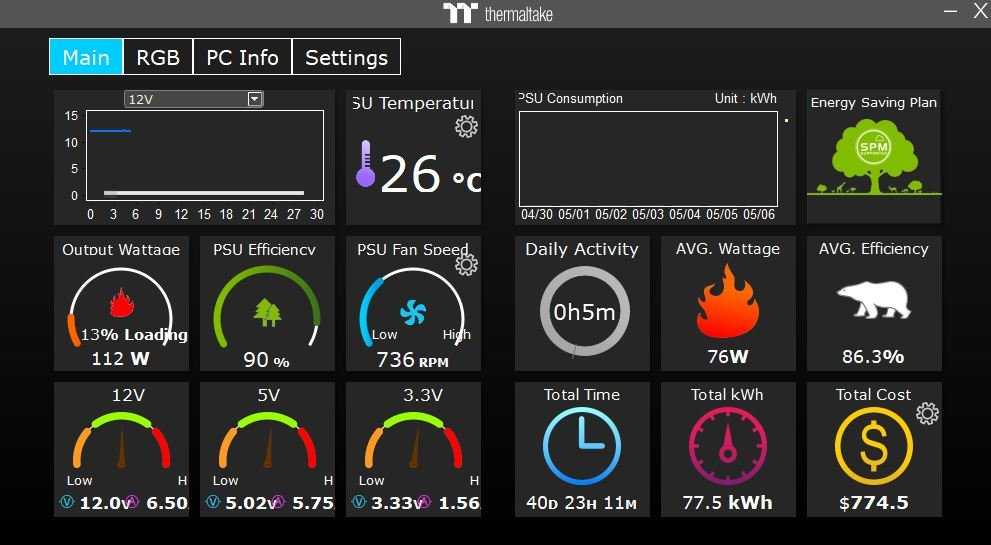Используемый блок питания контролируется ПО Tt DPS G App, которое точно показывает энергопотребление тестового стенда и его КПД, соответственно легко посчитать потребление тестового стенда из розетки. Нагружали систему в программе OCCT, максимальная нагрузка на БП составила 350 Вт в режиме теста Power.