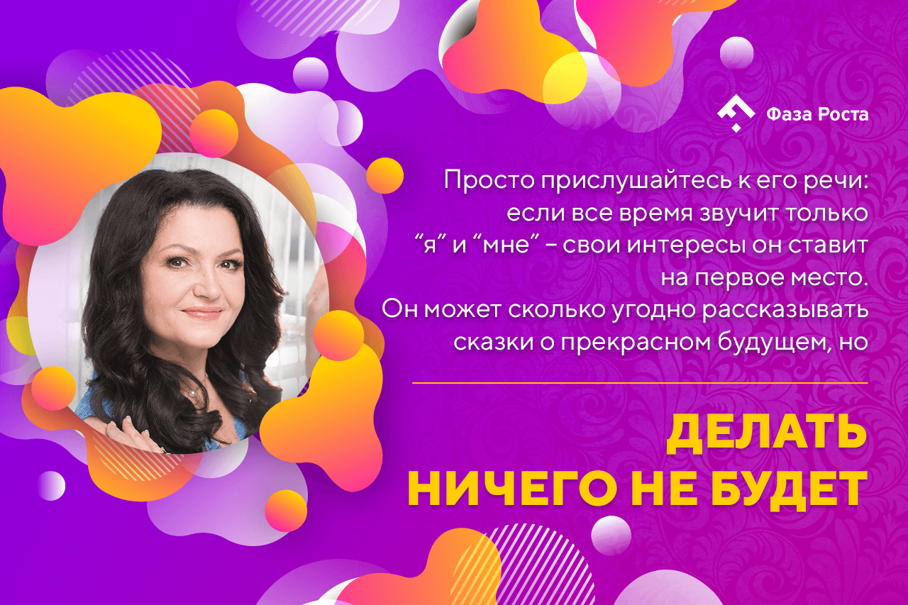 Просто прислушайтесь к его речи: если все время звучит только “я” и “мне” – свои интересы он ставит на первое место. Он может сколько угодно рассказывать сказки о прекрасном будущем, но делать ничего не будет.