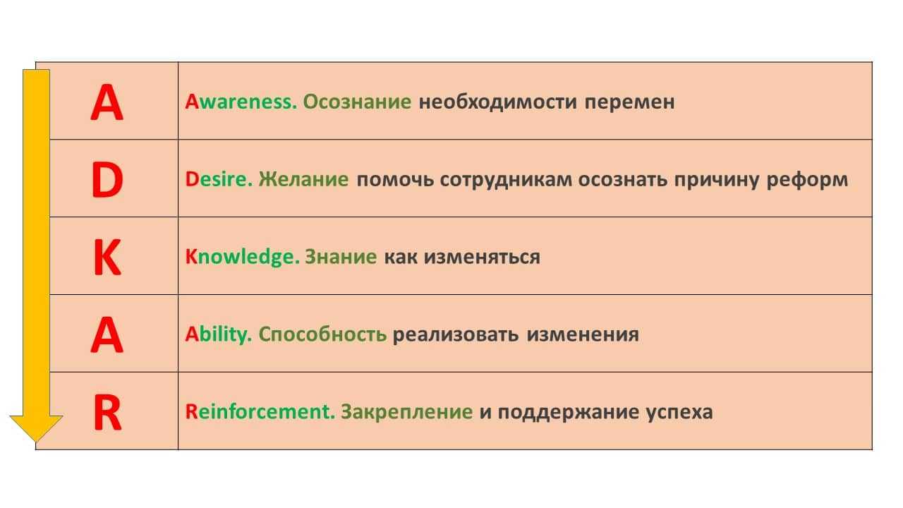Джефф Хайатт из Prosci Change Management создал модель изменений ADKAR. Основой для этой модели послужили долгосрочные исследования, которые Хайатт и его команда провели в более чем 900 организациях, которые переходили через изменения.