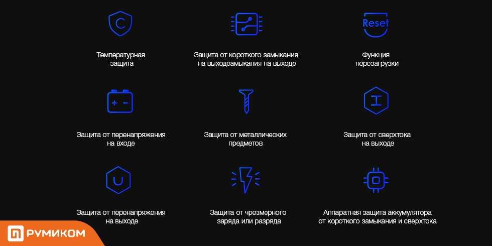 Помимо самой батарейной емкости для запаса энергии в конструкцию оригинальных повербанков Xiaomi в обязательном порядке входит система защитных датчиков и чипов-контроллеров для обеспечения безопасности для электроники базы и подключенного к зарядке мобильного гаджета. Аварийное автоматическое отключение происходит при следующих неполадках: