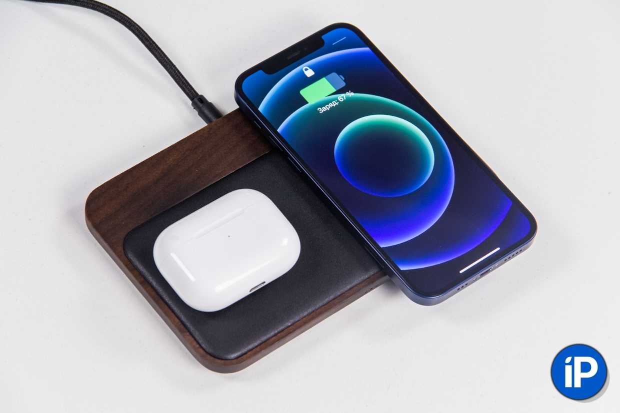 Внутри зарядки пара катушек, каждая из которых обеспечивает беспроводную зарядку мощностью до 10 Вт любых устройств, поддерживающих стандарт Qi: можно установить и iPhone, и смартфон на Android.