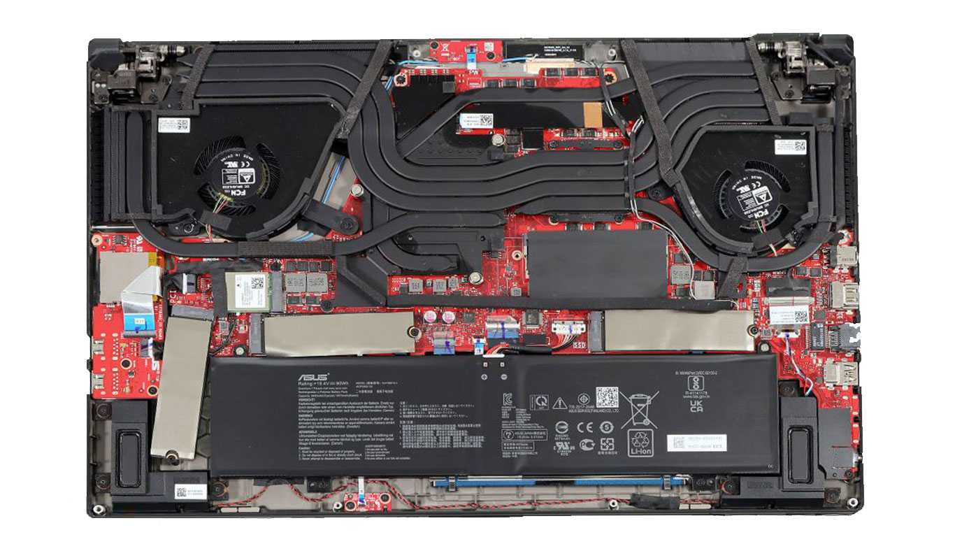 На дне ASUS ROG Zephyrus S17 GX703 есть несколько винтиков. Открутив их все, пользователь снимет крышку, которая скрывает доступ ко всем внутренностям ноутбука. Можно заменить оперативную память и поменять/добавить накопители.