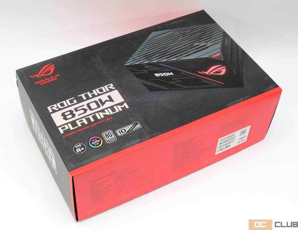Как и все статусные продукты линейки Republic of Gamers, блок ASUS ROG Thor 850 Вт поставляется в натурально шикарной коробке. Она не просто хорошая, она приносит впечатление от распаковки. Бокс крупный, тяжелый, с отличной полиграфией и оформлением.