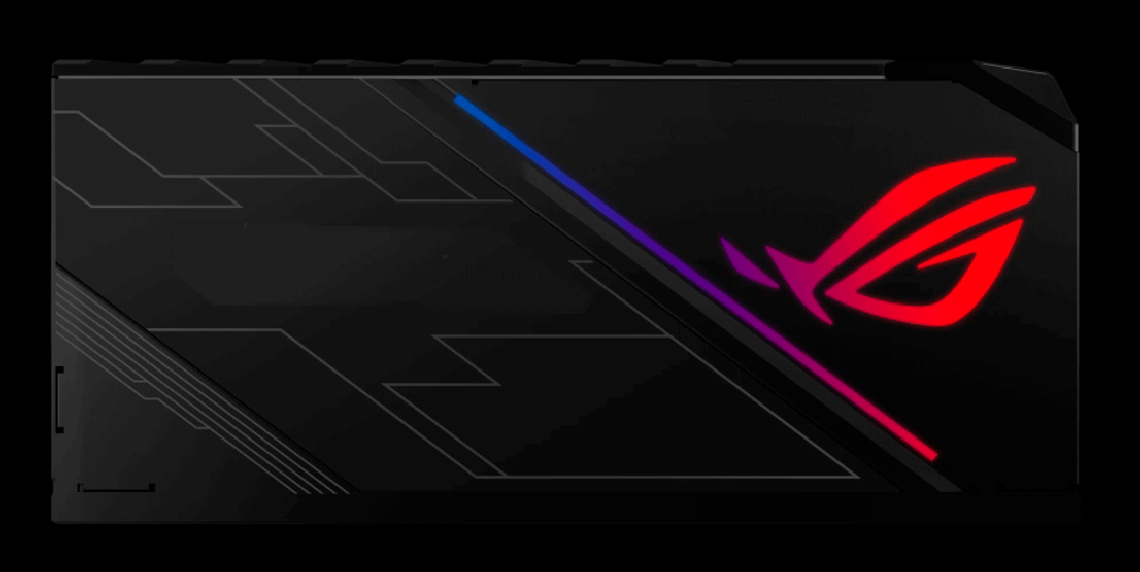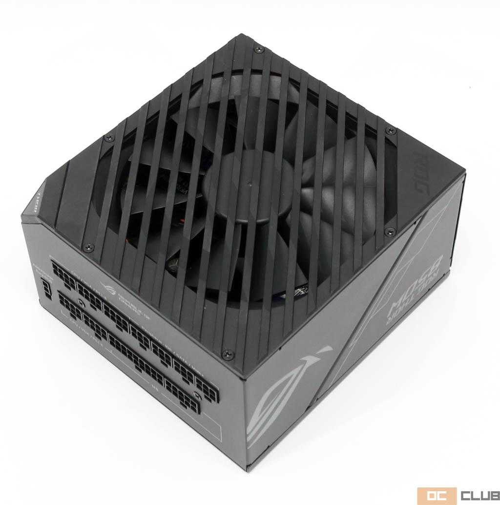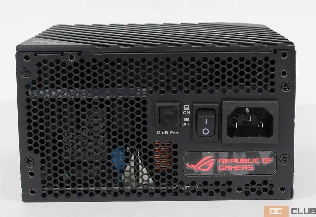 Логотип серии ROG присутствует на каждой грани без исключения, и с тыльной стороны тоже. Здесь всё тривиально: вводная розетка, тумблер включения и кнопка активации гибридного режима вентилятора, при котором вентилятор начнёт вращаться только при определённой нагрузке – после 50%.