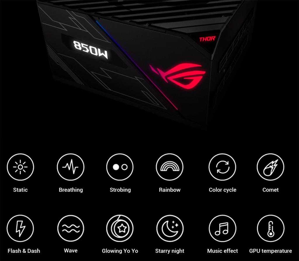 Для управления подсветкой необходимо подключить соответствующим кабелем сам блок к материнской плате. На плате должен быть 3-pin коннектор ARGB-подсветки (она же D-RGB). Подсветка управляется через ПО ASUS Aura и может синхронизироваться с другими комплектующими в системе. Эффектов подсветки масса – 12 штук + режим без подсветки. В случае отсутствия 3-pin разъёма на материнской плате подсветка будут всегда светиться просто красным.