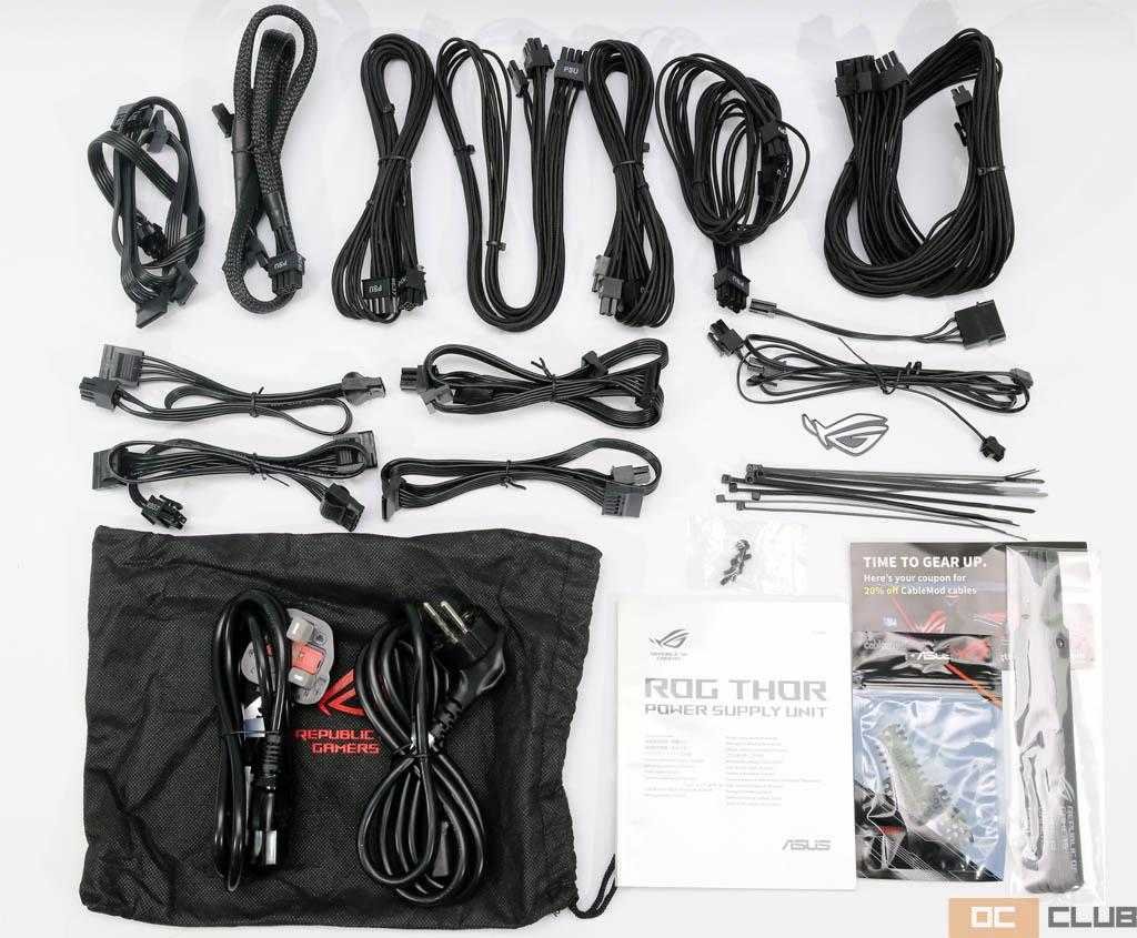 Что ж, ASUS ROG Thor 850 Вт радует хорошей комплектацией, а также поражает качеством коробки и необычным подходом к кабелям. Особенно, конечно, удивляют кабели в персональной оплётке жил т.к. это недешёвое удовольствие. Для понимания, магазин Cablemod продаёт аналогичный набор кабелей в оплётке за $50.