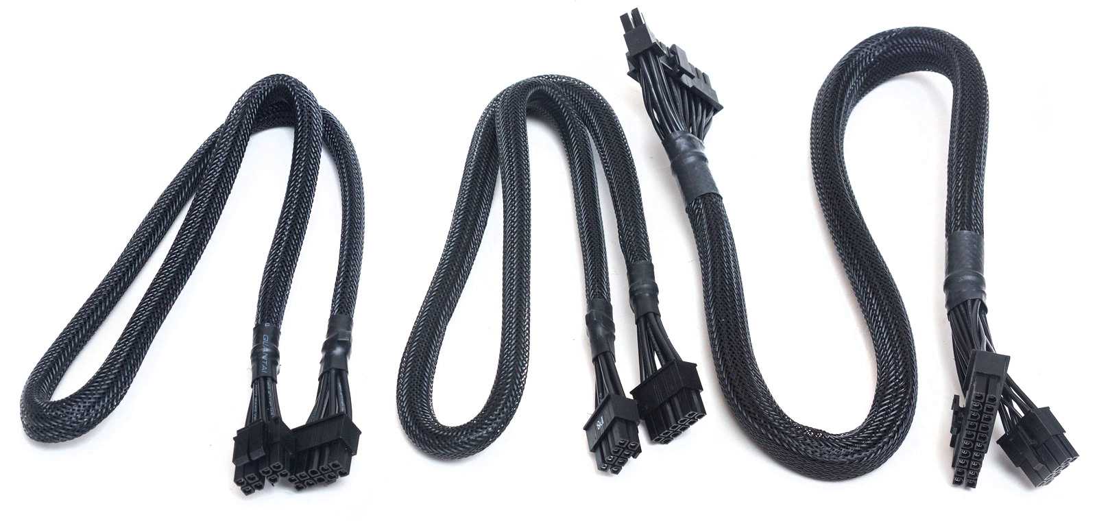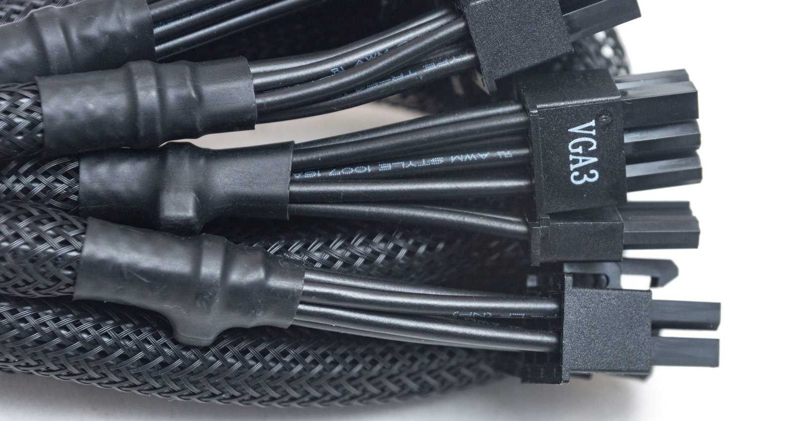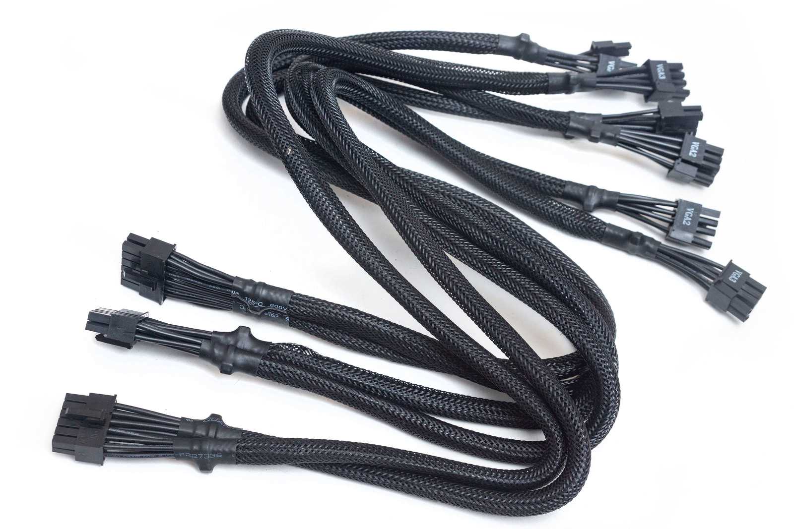 Необычно смотрится решение проводов для питания PCI-E — не разветвитель на конце, а кабели полноценной длины для каждого 8-пинового разъема. Каждый разъем при этом имеет собственные контакты при подключении к модульной плате на БП, что дает меньшую нагрузку на провода и соответственно меньший нагрев колодок.