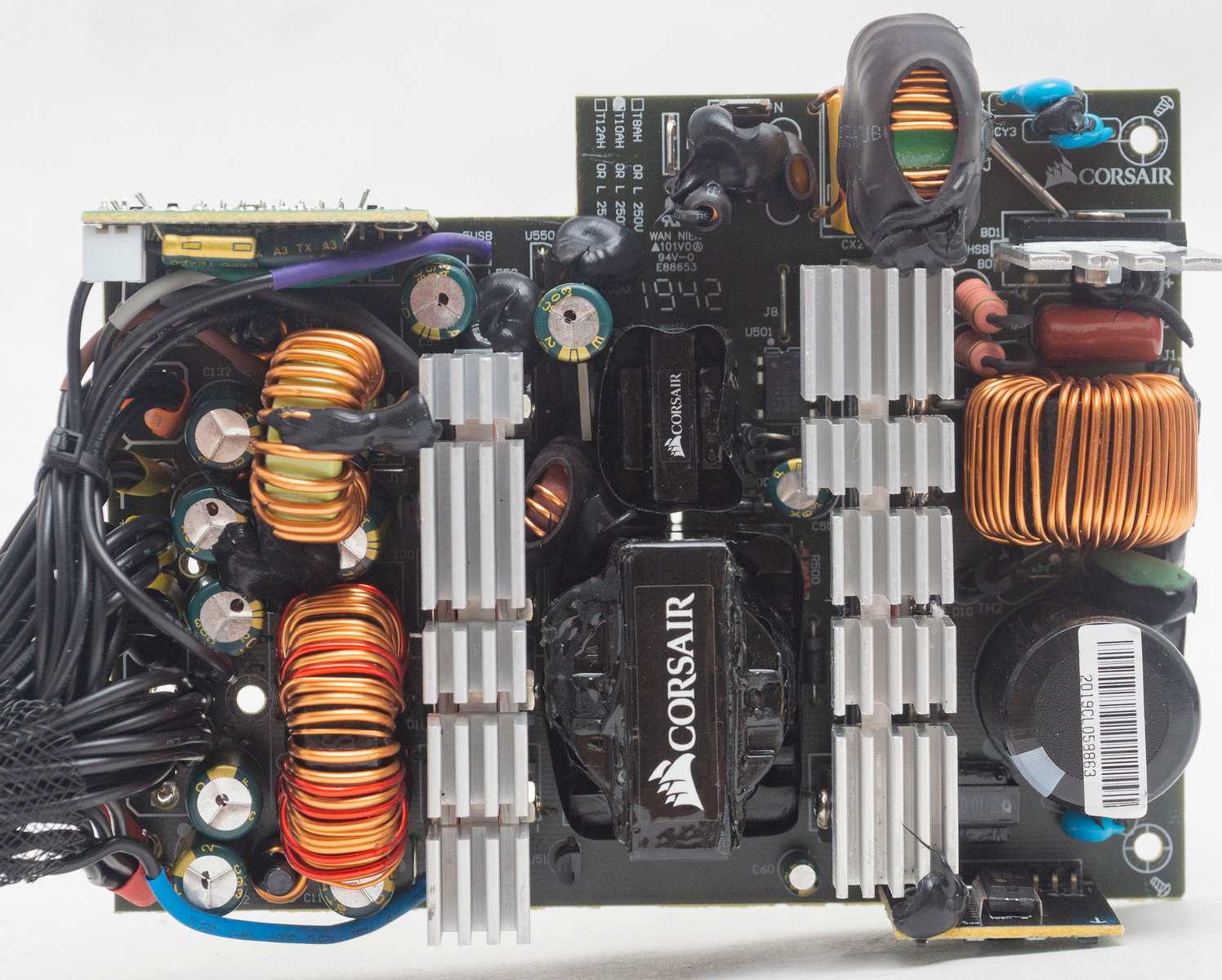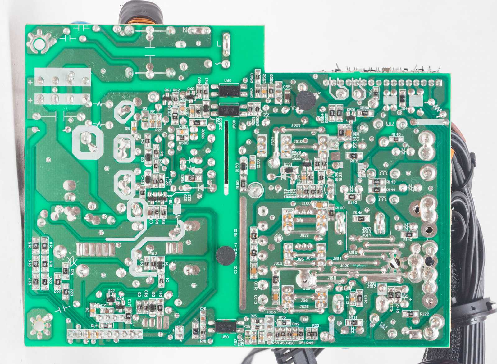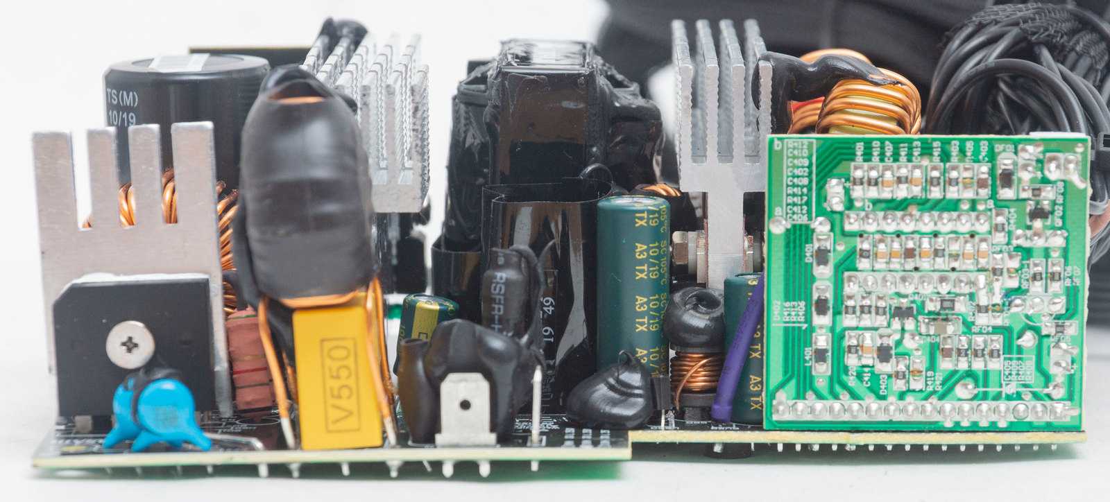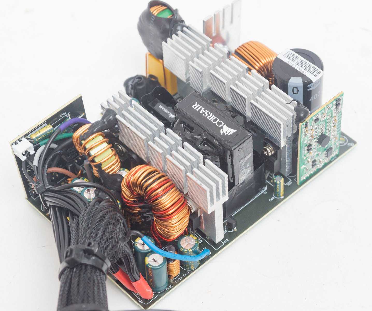 Теплоотводящие радиаторы модели APS-850CB, как и в большинстве современных блоков питания с эффективной схемотехникой и высоким КПД, имеют достаточно скромные размеры, поскольку даже при максимальной нагрузке потери мощности на тепловыделение минимальны. Также стоит отметить безупречное качество пайки, изоляции и экранировки критичных элементов схемы, безупречный крепёж крупных компонентов и превосходную разводку платы выходных кабелей питания.