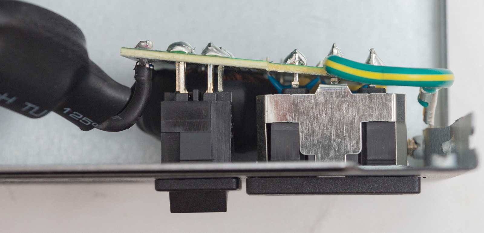 На входной розетке отдельная плата с двумя Y-конденсаторами, двумя X-конденсаторами и дросселем в термоусадке.
