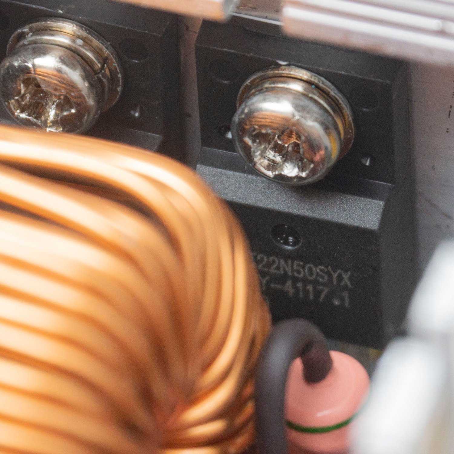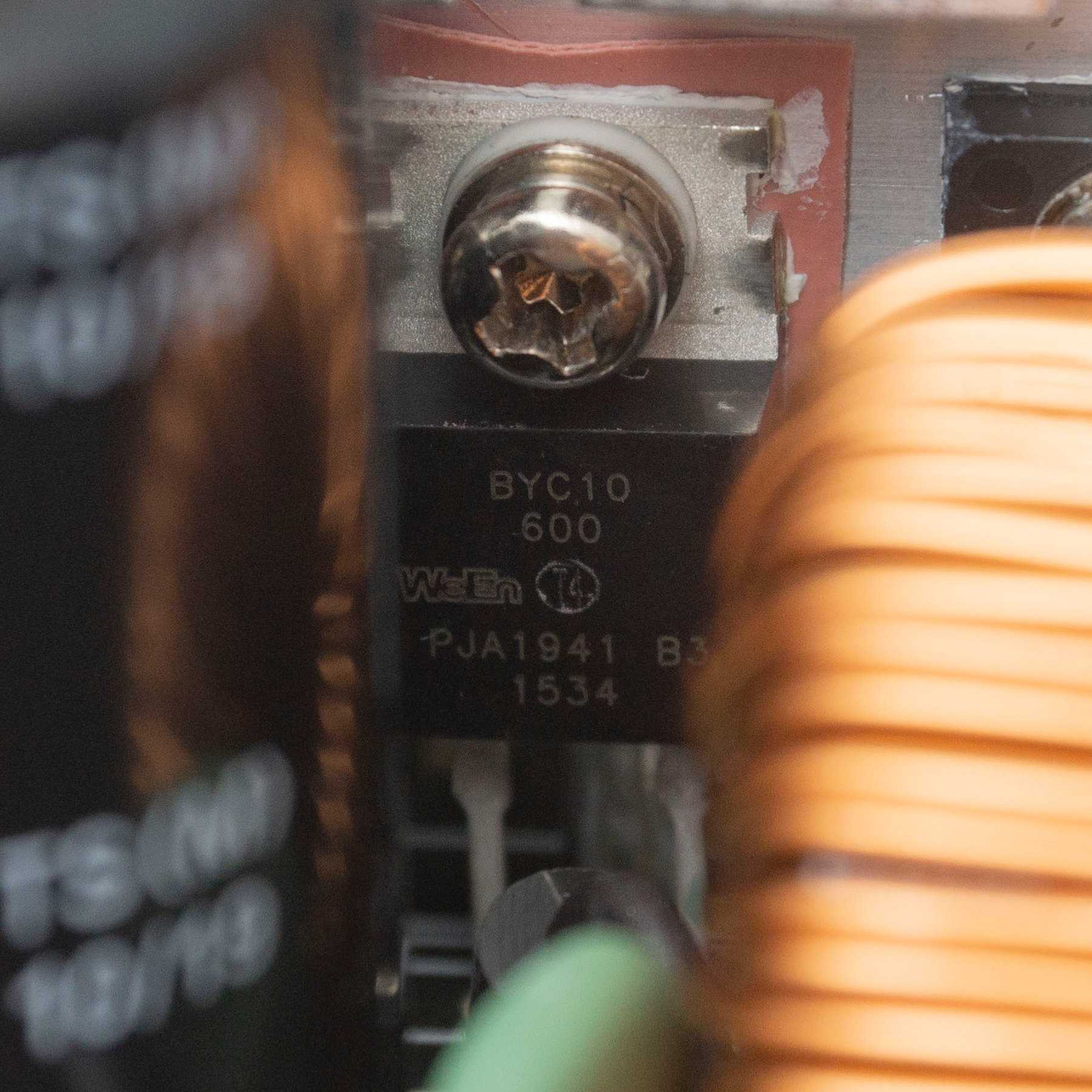 Далее находится массивный дроссель APFC, расположенный перпендикулярно радиатору, охлаждающему силовые элементы корректора и ключи первичного преобразователя – диод WeEn Semiconductors BYC10600, рассчитанный на 600 В и 10 А, и четыре транзистора 22N50 по 500 В, 22 А.