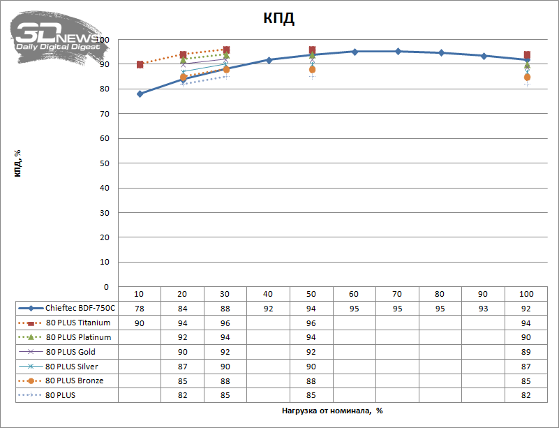 Измеренный в ходе теста КПД блока питания Chieftec BDF-750C показывает вполне ожидаемые результаты.