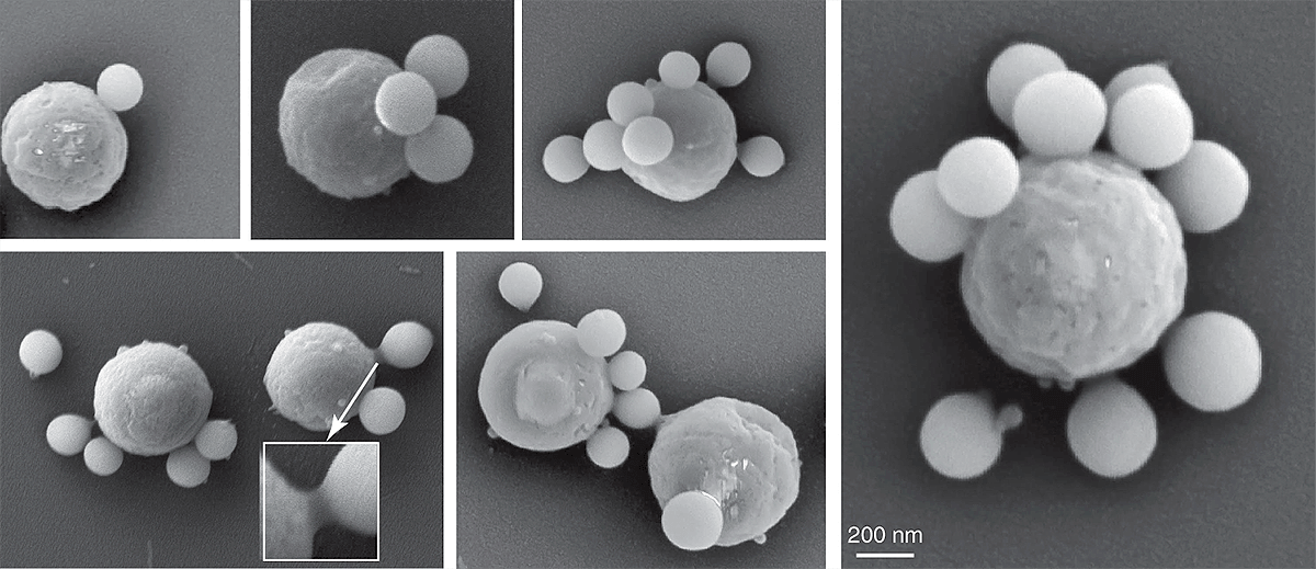 Рисунок 1. Наноархея Nanoarchaeum equitans (маленькие шарики) паразитирует на архее Ignicoccus hospitalis (большие шары). Фотографии получены с помощью сканирующего электронного микроскопа. На некоторых изображениях видны мембранные контакты клеток.