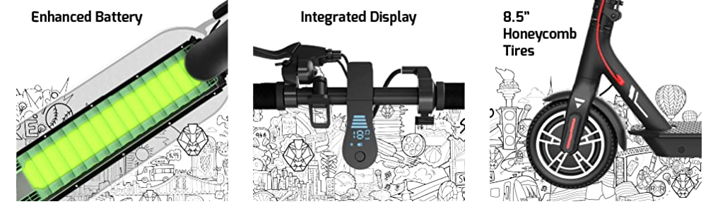 - В комплекте идет встроенный светодиодный дисплей, который информирует об увеличении скорости и уровне заряда батареи. Яркие фары и задние фонари позволяют безопасно путешествовать ночью.