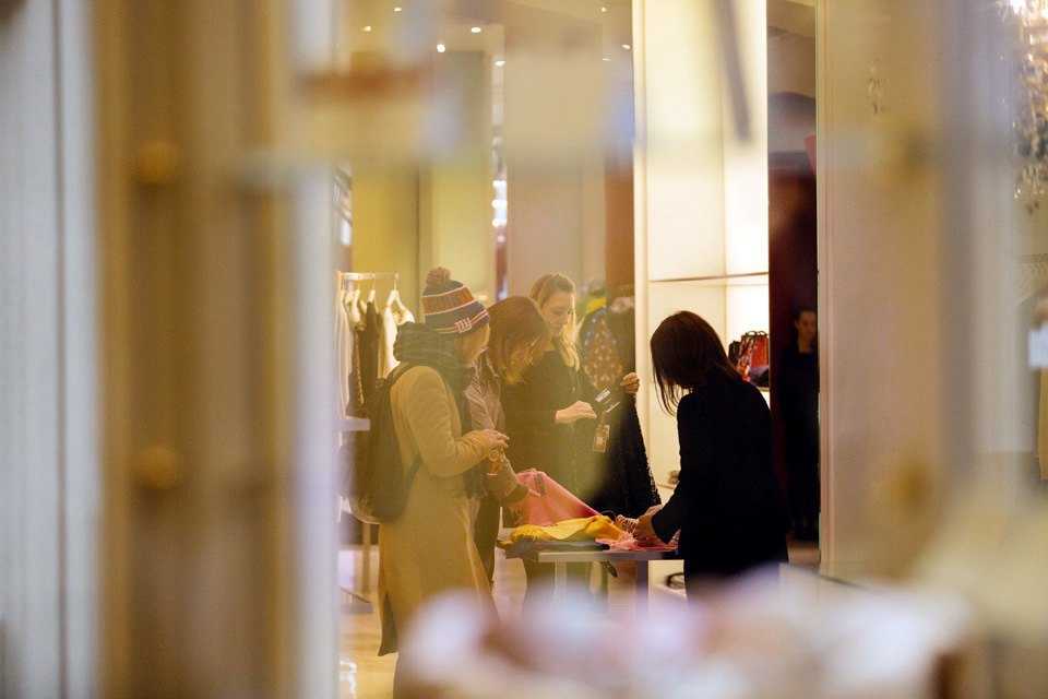 Пока я пытаюсь справиться со сложным кроем платья в примерочной, мои компаньоны донимают рыжеволосого консультанта вопросами о самых дешёвых товарах и делают селфи на фоне туфель.