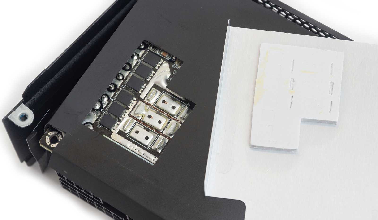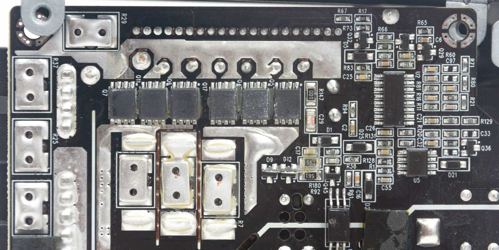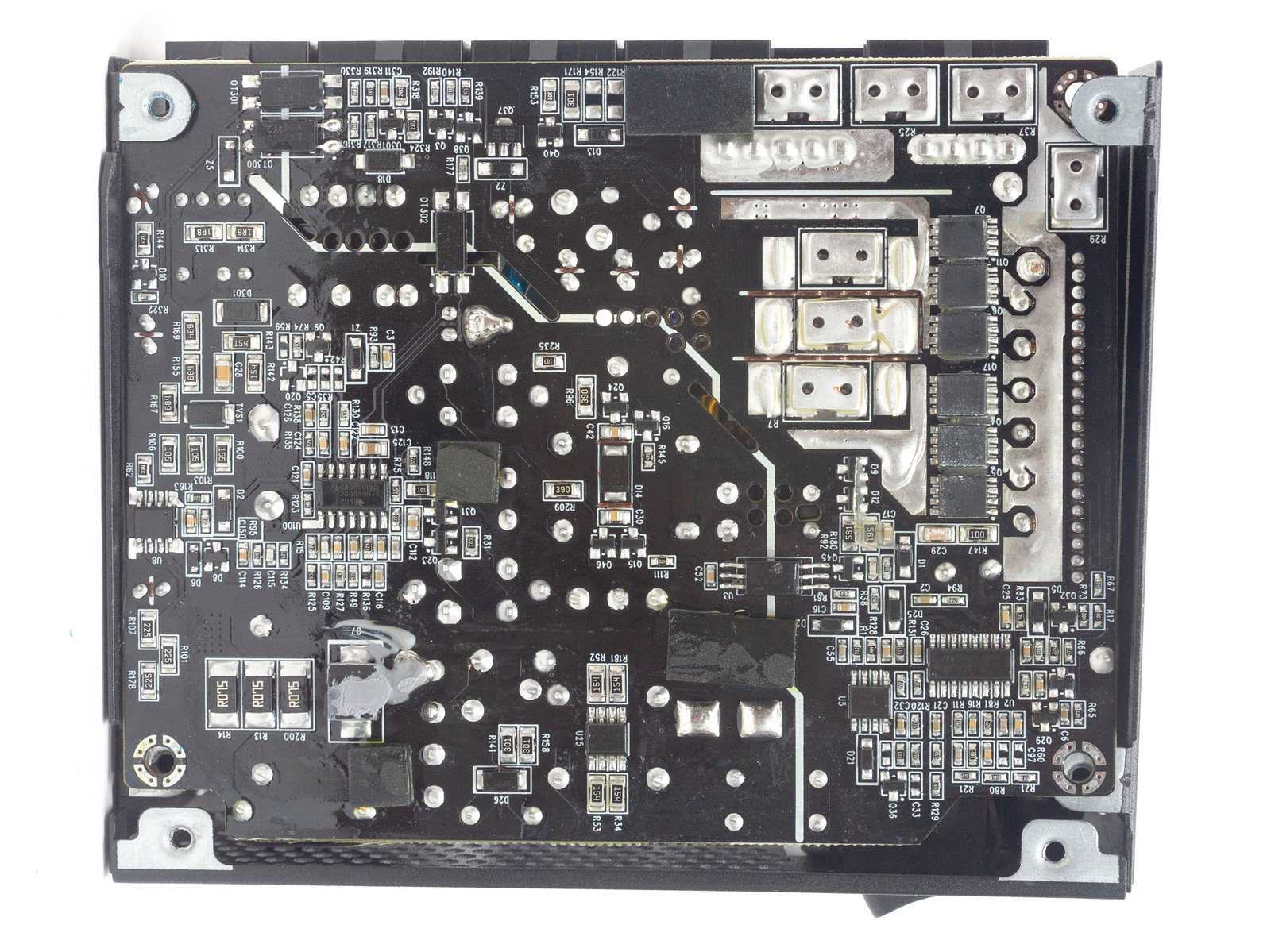 Мосфеты на тыльной стороне платы охлаждаются через термопрокладки металлической пластиной, которая в свою очередь передает тепло на внешний корпус. Вся остальная часть платы закрыта диэлектрической прокладкой.