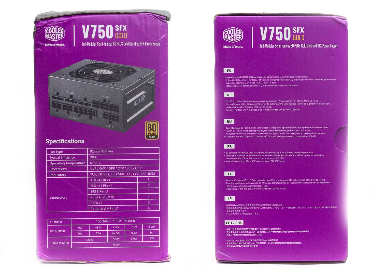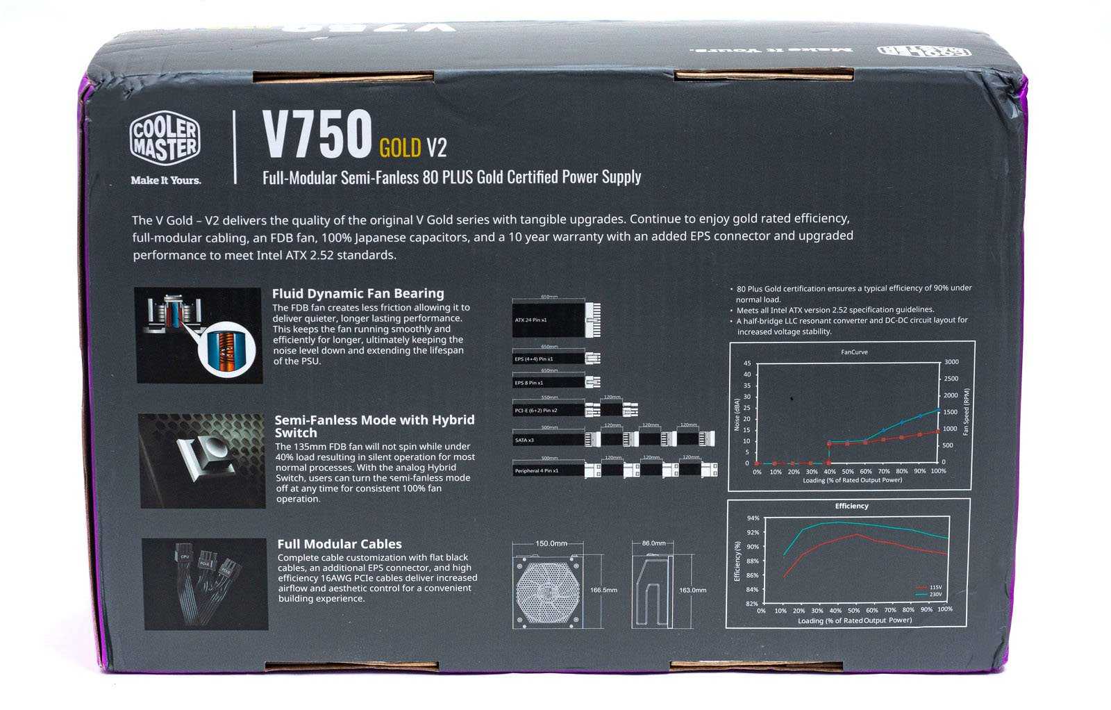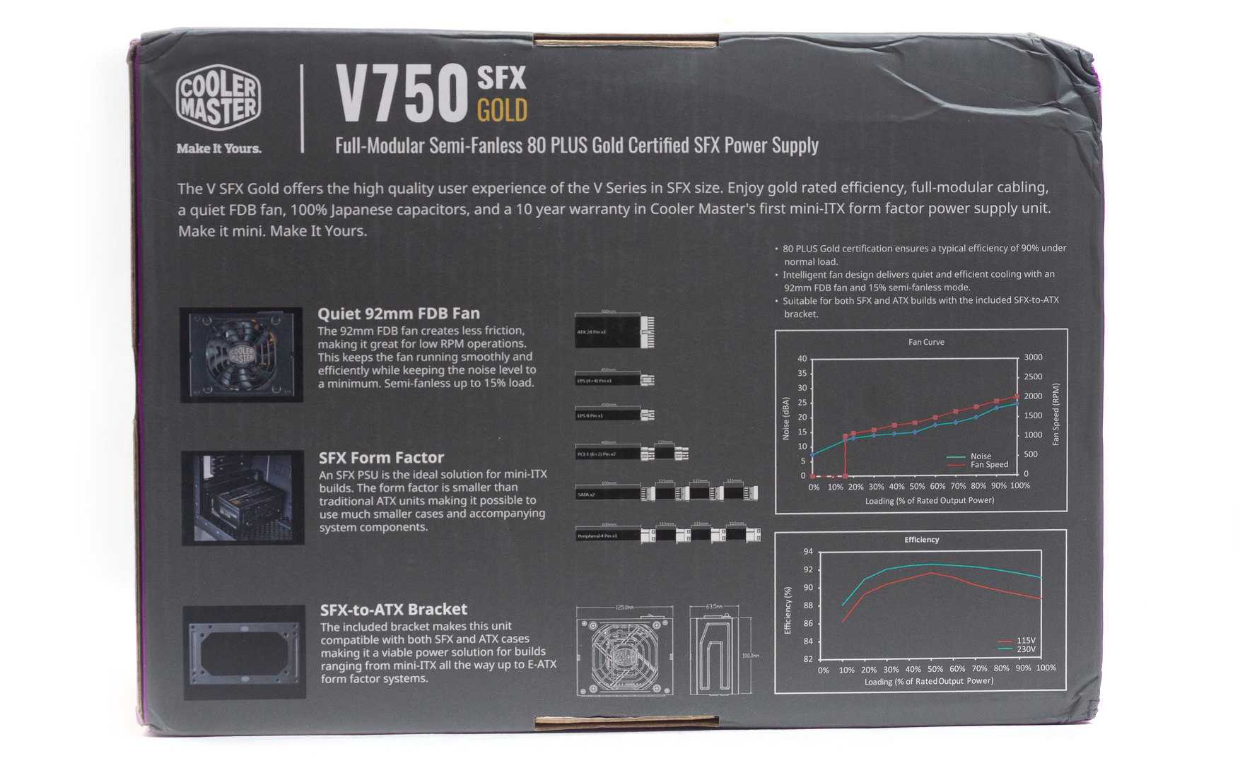 С обратной стороны дано более подробное описание возможностей модели: графики КПД и работы вентилятора, чертеж изделия, описание кабелей и коннекторов.