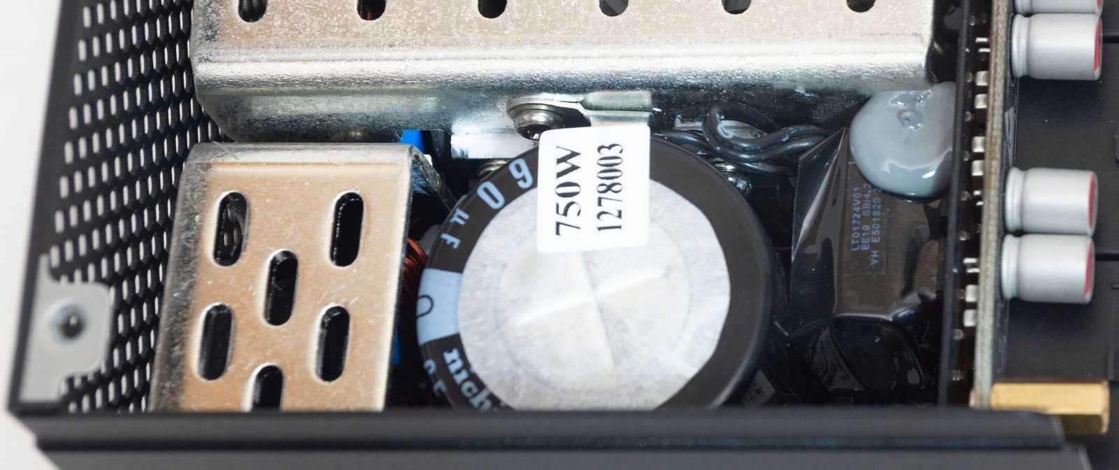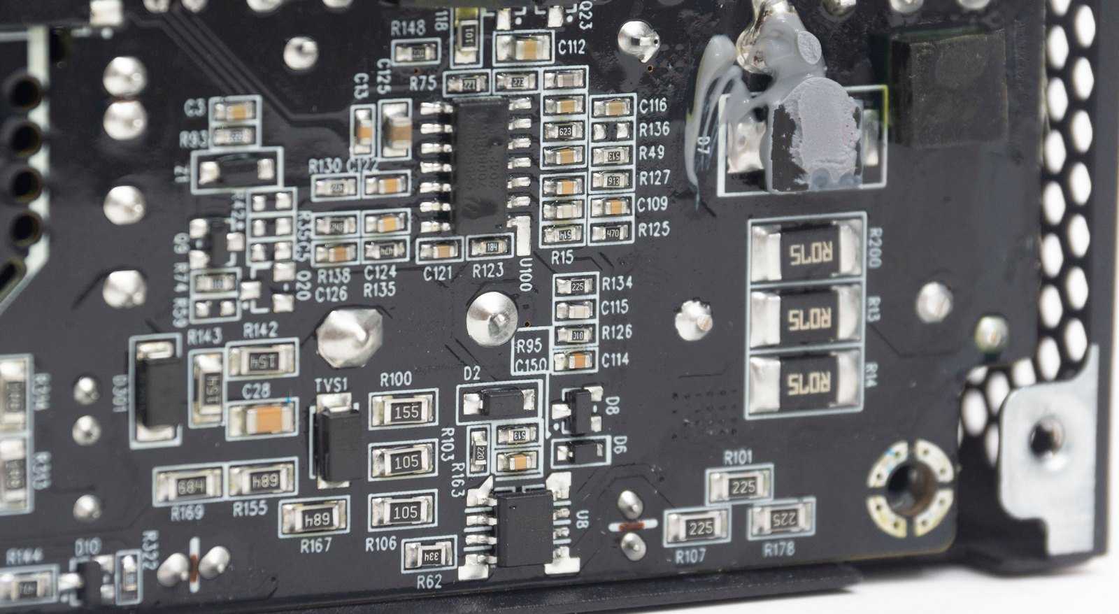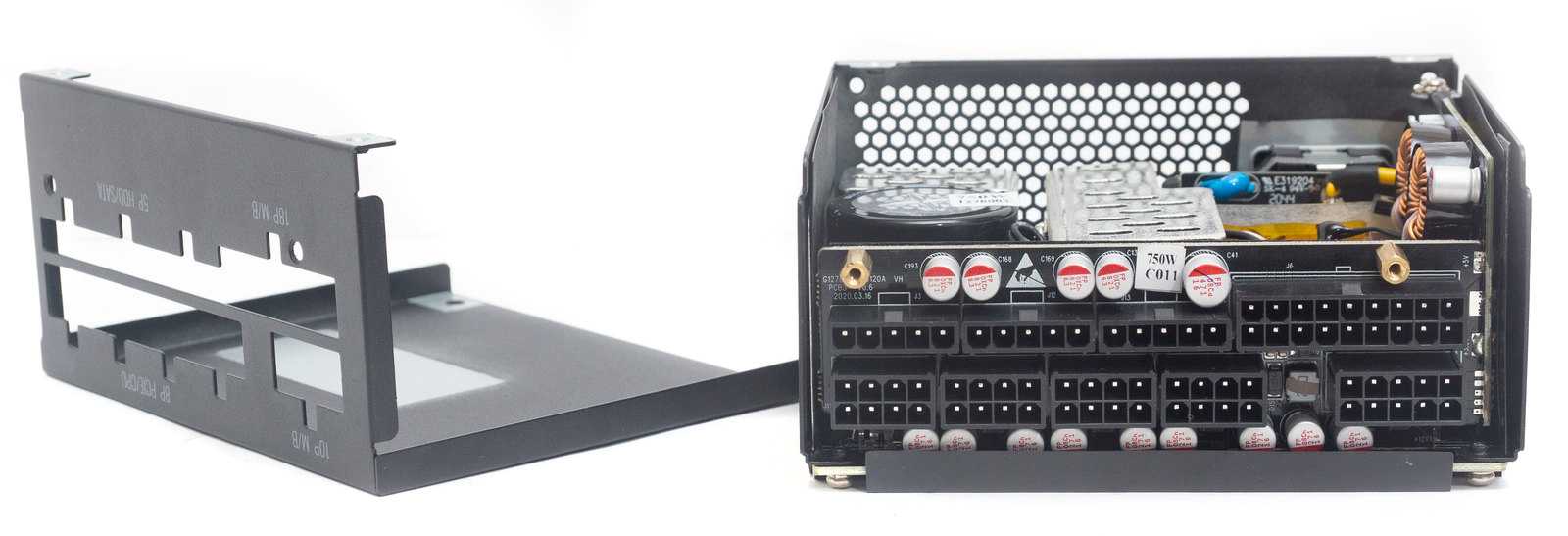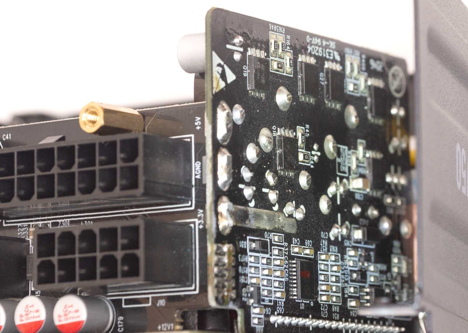 На плате для подключения модульных кабелей распаяны дополнительные сглаживающие твердотельные конденсаторы.