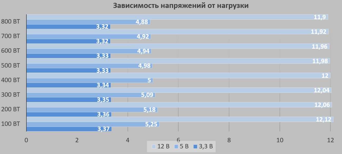 Тестовый стенд позволяет нагружать линию +12 В с шагом в 100 Вт. Линии +3.3 В и +5 В подключались к постоянной нагрузке в 50 Вт.