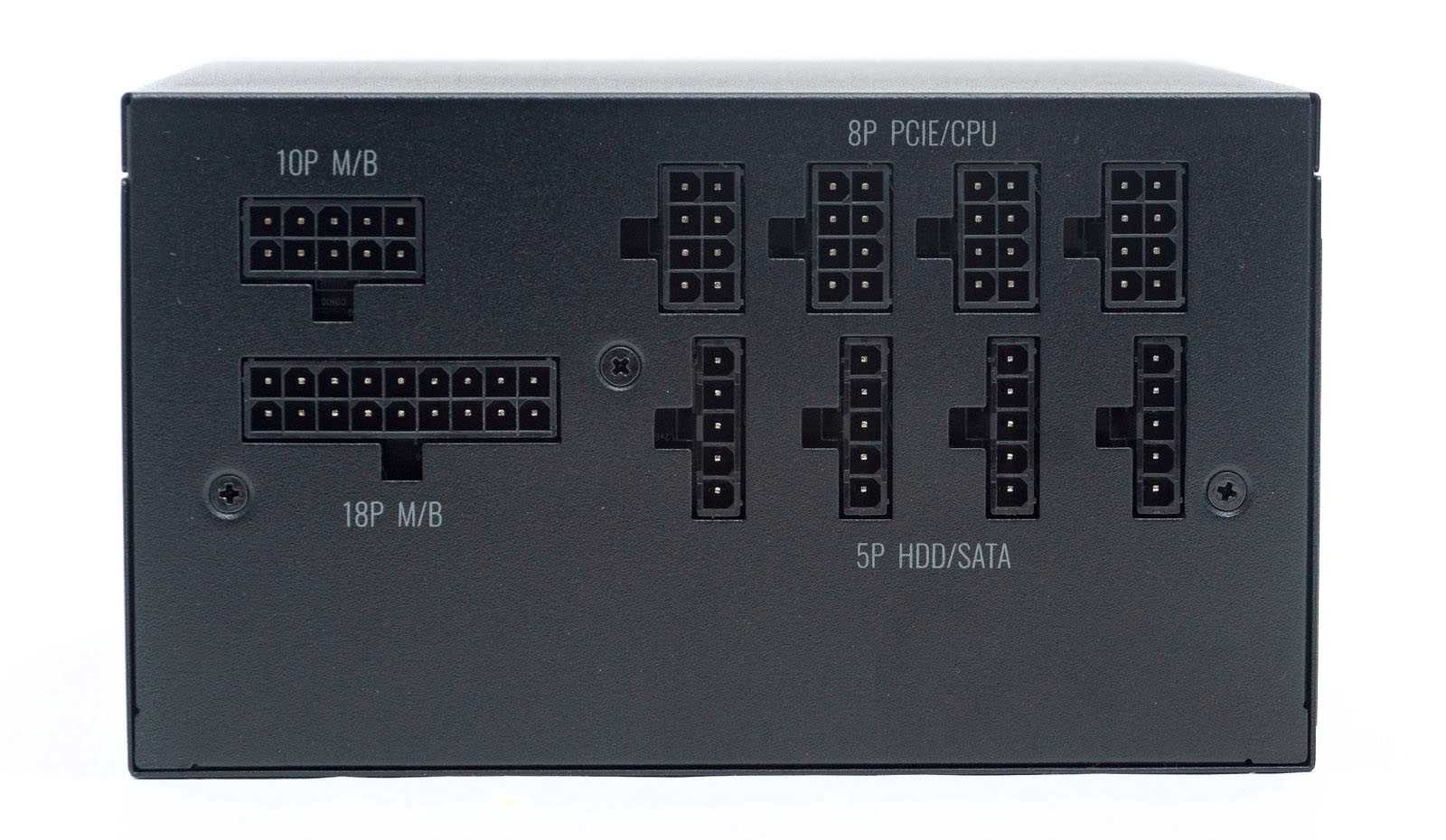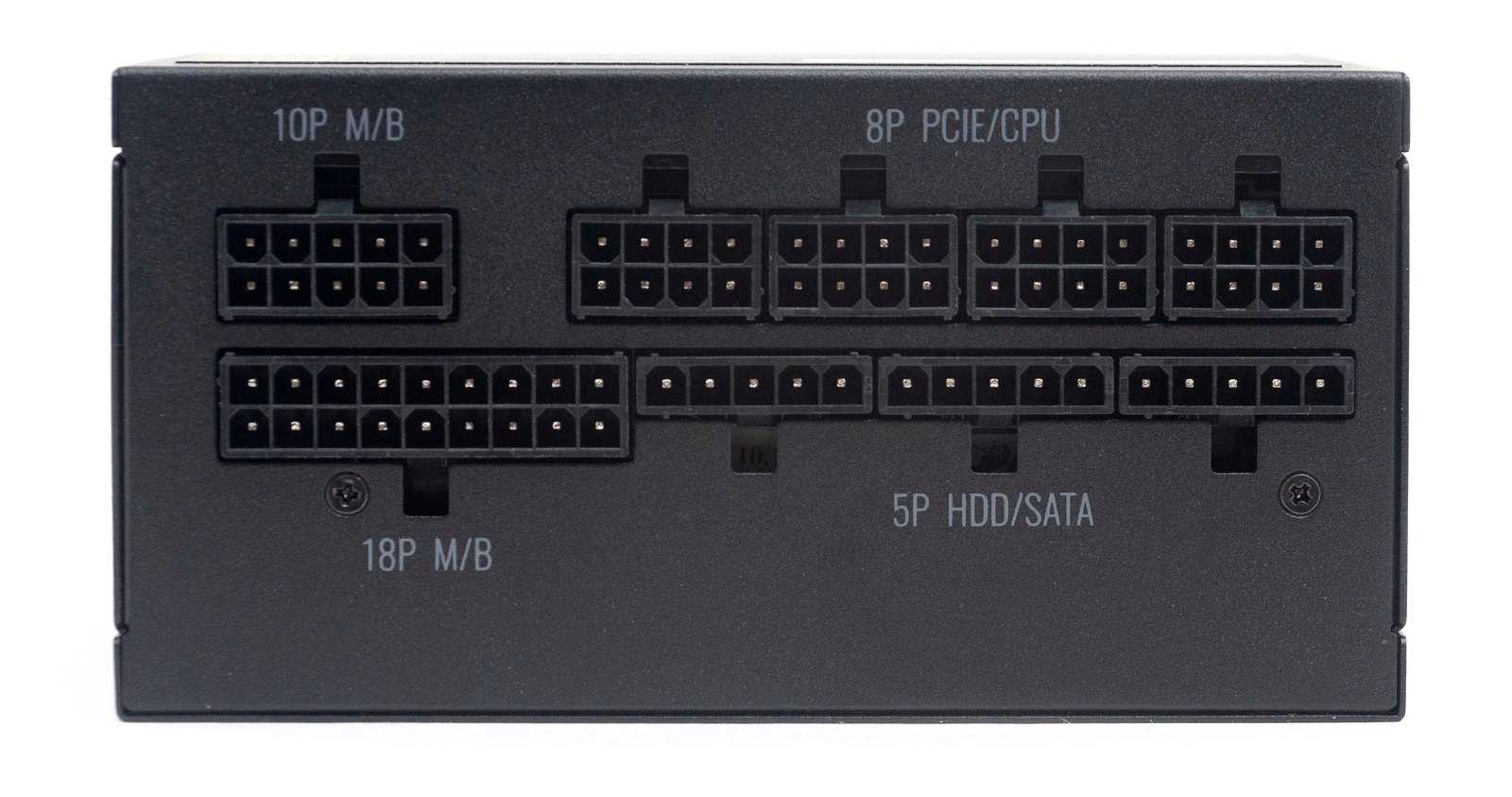 На лицевой стороне разместились разъемы для подключения модульных кабелей. Основной ATX-кабель разделен на две колодки 10 и 18-пин. Верхний ряд для 8-пин колодок CPU и PCI-E. Нижний ряд для подключения кабелей периферийных устройств выполнен в виде колодок на 5-пин в один ряд.