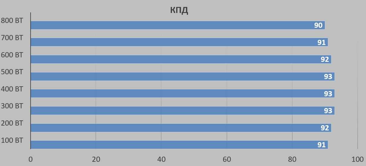 Благодаря отдельным DC-DС преобразователям нагрузочные характеристики практически линейны. Все отклонения напряжений питания находятся в допустимых пределах. Зависимость КПД блока питания от мощности, отдаваемой в нагрузку имеет ярко выраженный пик, что является нормой для импульсных источников питания. Также необходимо отметить, что схемотехника блока не классическая. Силовая часть построена по резонансной мостовой схеме, что повышает устойчивость блока питания к короткому замыканию. Кроме того, наличие управляемого выпрямителя позволяет снизить потери во вторичной цепи.
