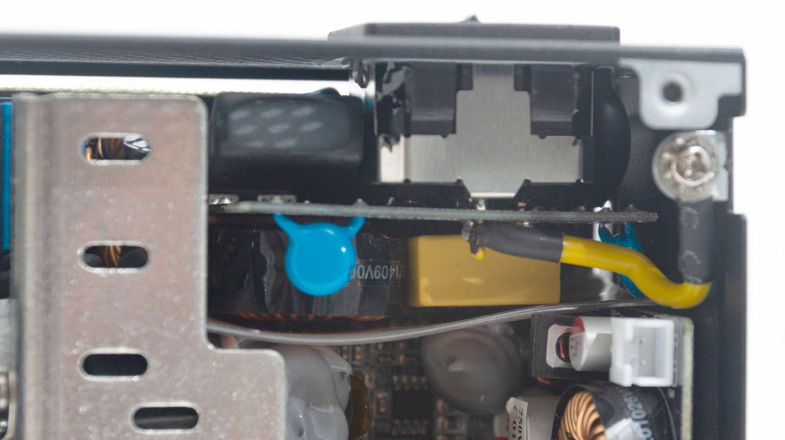На входе мы видим полноценный EMI-фильтр: четыре Y-конденсатора, Х-конденсатор, дроссель. Для защиты самого БП имеется плавкий предохранитель.